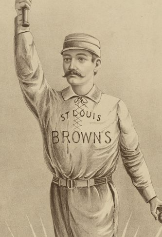 Here is one of my favorite images from this era. 1886 Champions, St. Louis Browns, The Monarchs of the Sphere. My goodness the old-timey audacity they had back then, it’s truly amazing. On top of being a great drawing and piece of art, we get a beautiful depiction of what 19th Century baseball players looked like, and possibly what we looked like in the World Series. This image is unique because of the two lines of text on the jersey, using the team name as well. We have lots of newspaper articles that say the team wore ST. LOUIS BROWNS on the uniform, but we have never recovered any physical samples or photographs to corroborate that claim.