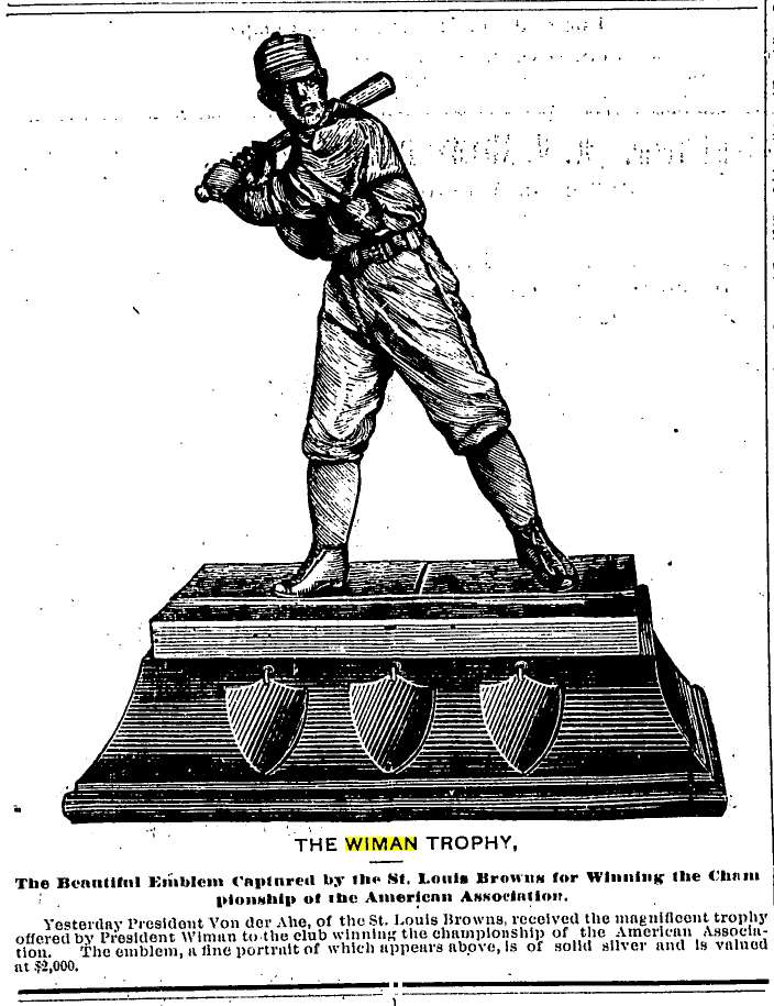 The Wiman trophy was given to the winner of the American Association. The trophy depicts a 19th century baseball player in really awesome detail, and gives us a good idea about what players looked like in the 19th Century. And beyond that, there is an oddly complicated history behind Erastus Wiman, the man who commissioned the trophy, which you can read all about on this website, and again John Thorne’s blog.