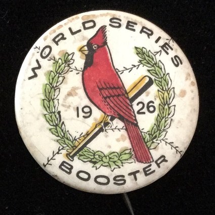This is the press pin for the 1926 World Series. Press pins were given out to members of the media present at the games to document. The designs of these pins proved very popular, and they have become collectors items. They also have been so popular that they still get made with unique designs for modern World Series. The Cardinals own a complete set of all 19 official pins.