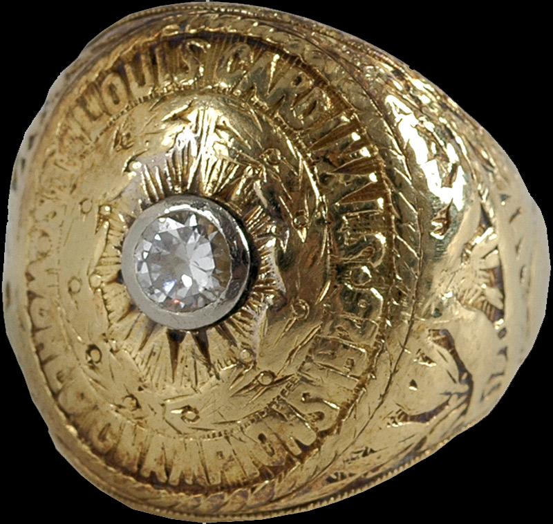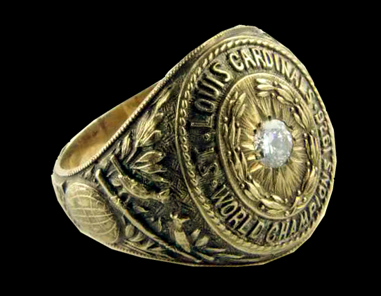 These two images are the 1926 World Series championship ring. The pictures come from WorldSeriesRings.net. These rings are considerably modest compared to today’s championship rings. Note the little Birds on the Bat on the sides of the ring.