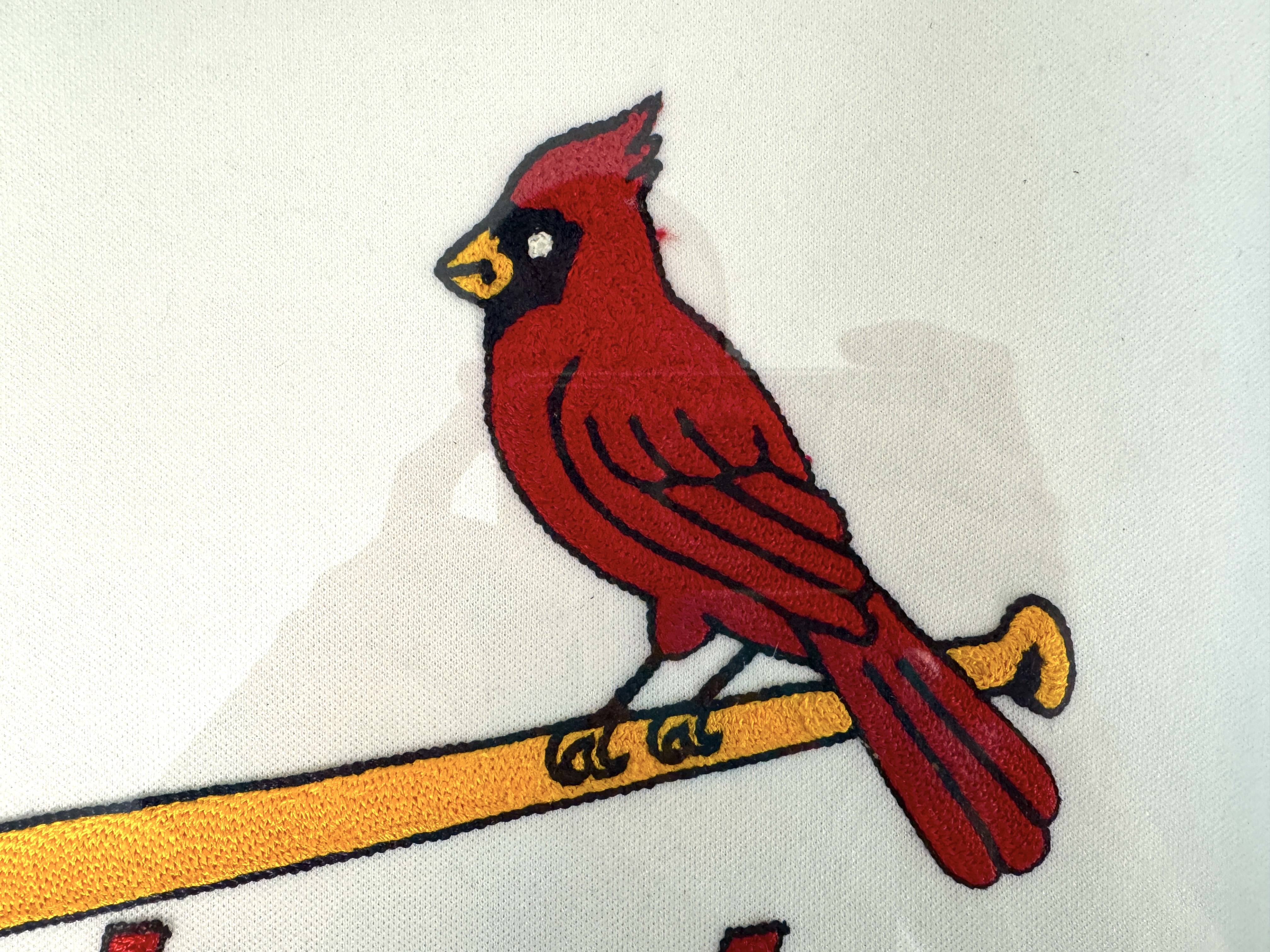 Second, upon close inspection, the outlines are black threads and not navy threads. When these logos were being made, and presumably also these stitching samples at the same time, the official design was to use Pantone 289, a very dark navy blue. And historically as well, looking back at Birds on the Bat from the past such as 1940s, 1950s, and early 1960s, there were 4 thread colors used. Red and yellow threads were used for the fills. Navy blue was used for the outlines, and black was used for the bird’s facemasks. The modern Birds on the Bat design ditched black threads completely and went with navy all around for both the outlines and facemasks. But in this piece, they used black threads.