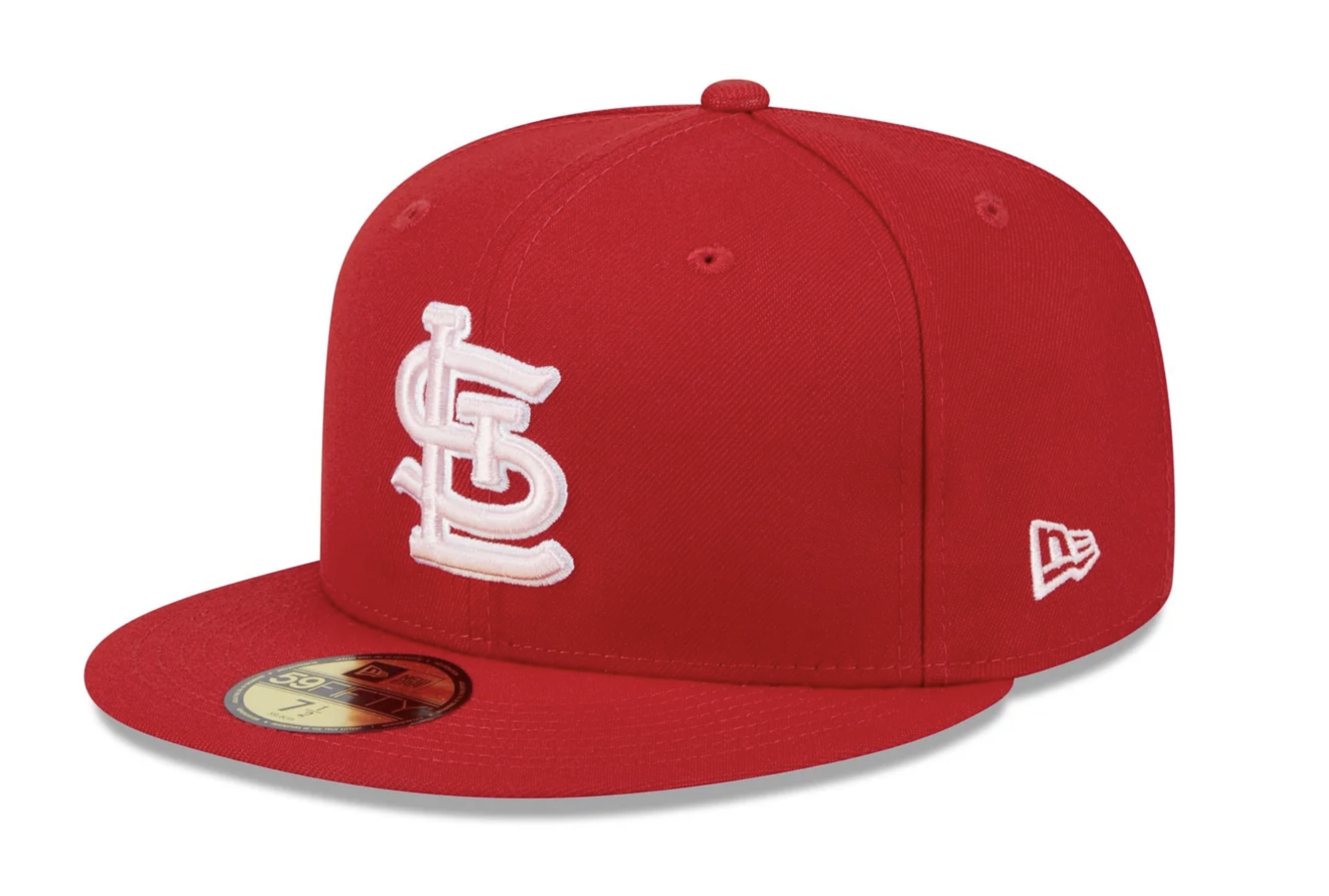 The standard red hat was modified with a pink STL and a white outline. Really hard to see the differentiation between the white and pink considering how light the pink is. It looked like a big blot on the cap on the broadcast when viewed from afar, and when zoomed in it looked like one giant fat pink monogram.
