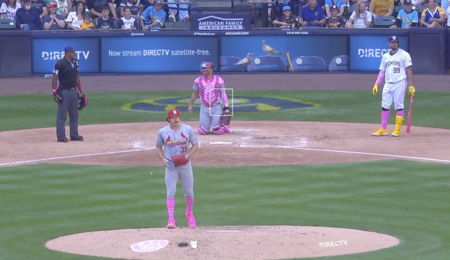 I noticed on the broadcast the Brewers were wearing pink helmet decals, but the Cardinals were not. The Brewers were also wearing pink belts, but the Cardinals opted to wear their standard red belts. Didn’t take a screenshot.