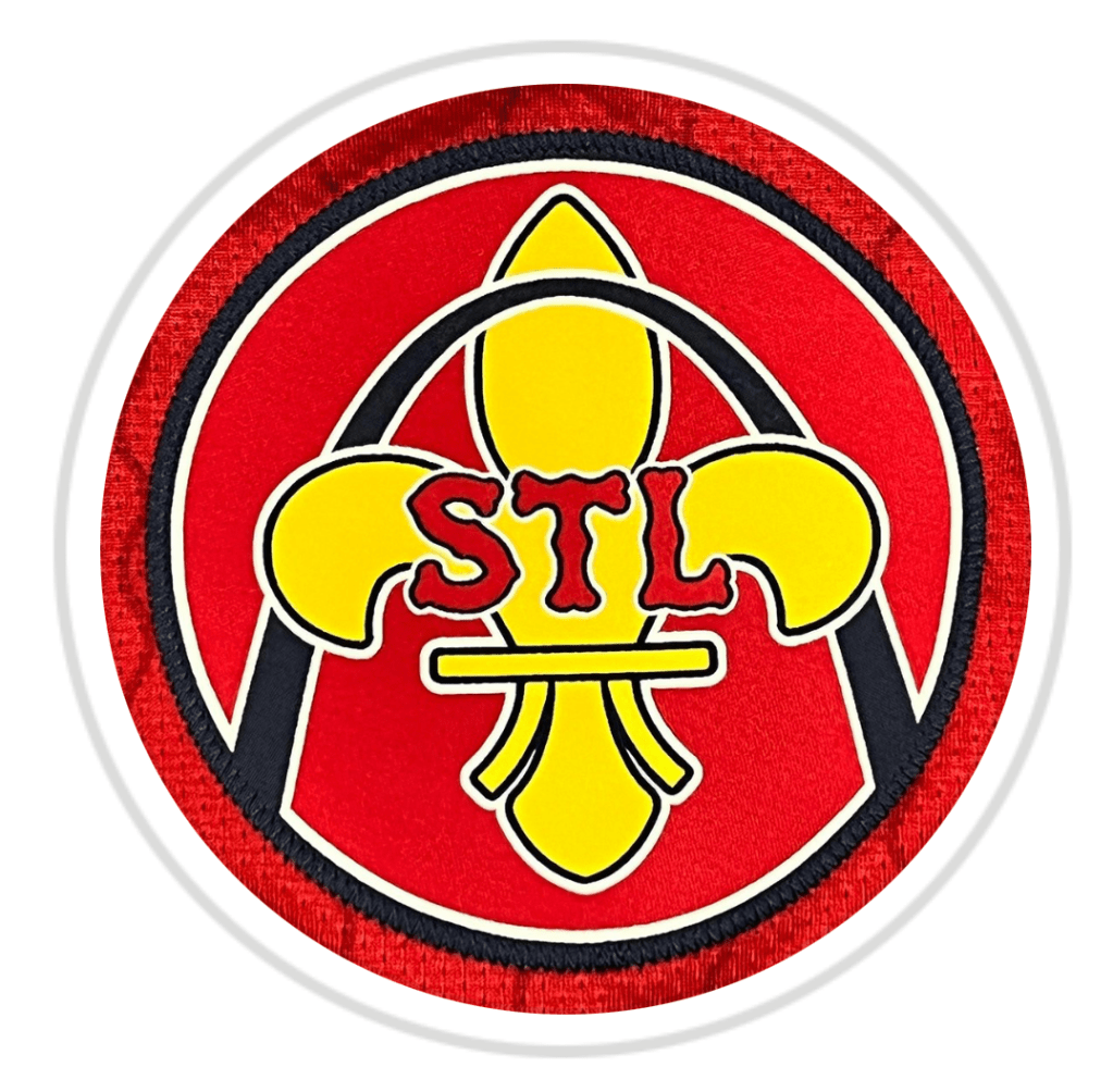 On one sleeve is the advertising mark with its colors reversed compared to our other four uniforms, and on the other sleeve we have a brand new logo. Interesting logo, not really excited about it. Yellow fleur de lis, red STL, blue Arch. Just ok. Really reminds me of a soccer logo for some reason.