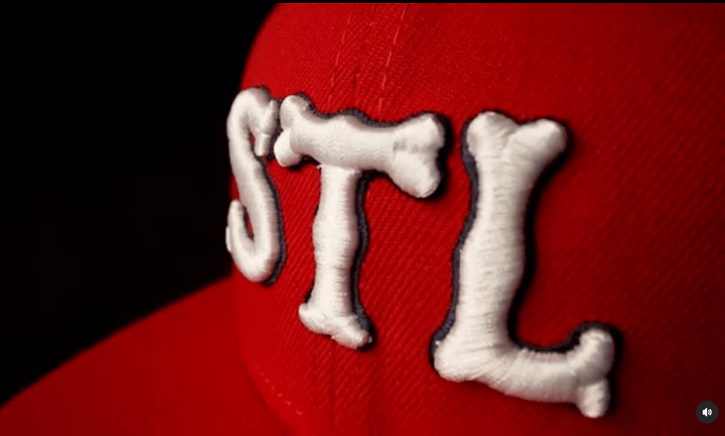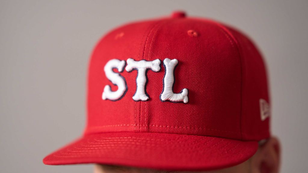 We feature a solid red cap with an STL in white and thin navy outline. This STL lettering harkens back to the 1920 jersey lettering, and even the alternate jersey worn in 1922. The biggest difference with the cap lettering is that it isn’t arched, it all sits horizontally straight across. I think an arched lettering would have been a little nicer touch, while the flat letters seem a little generic and boring. There are plenty of other STLs in our historic collection that would have been nicer to see on the cap. Plus, I think the importance of an interlocking STL emblem is paramount when the only stipulation for these uniforms is connecting the team to the city. This team is represented by two main icons, an interlocking STL monogram, and the Birds on the Bat. That’s it.