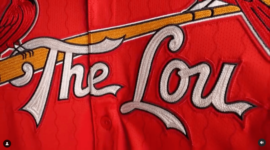 Speaking of the Birds… Luckily we have the Birds on the Bat, and the design of the birds themselves was not tampered with. Instead of reading Cardinals or St. Louis, we get a familiar phrase in The Lou under the bat, styled in similar letters to our standard script. Note that the Birds and Bat has a thin white outline around them, while the lettering is rendered in white with a blue outline, and no further white outline around the letters.