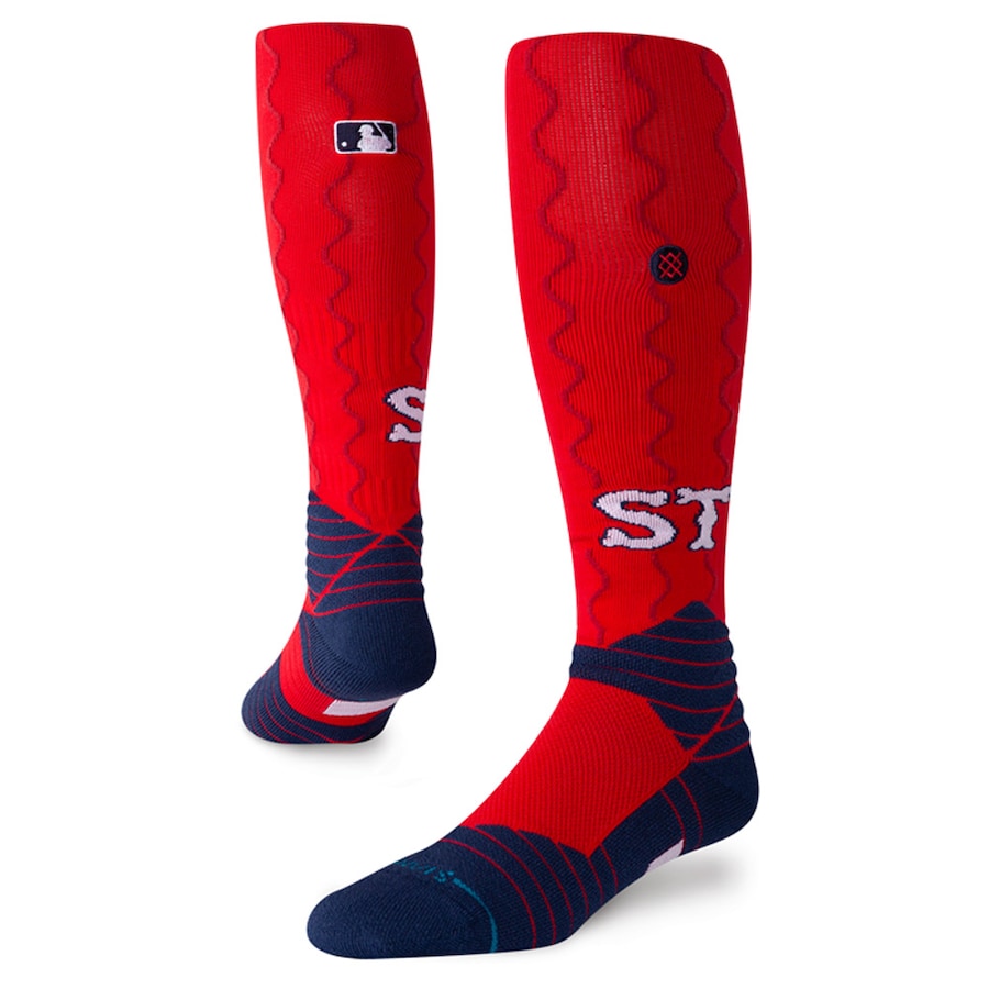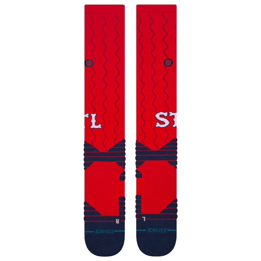 The socks are odd. Same wavy river pinstripes running vertically with the socks. Kinda odd there. most often times you see sock piping running horizontally around the leg, while these move up and down the leg. the STL from the cap is printed on the sides of the socks, with the blue ankle thingy that Stance adds to every pair of socks.