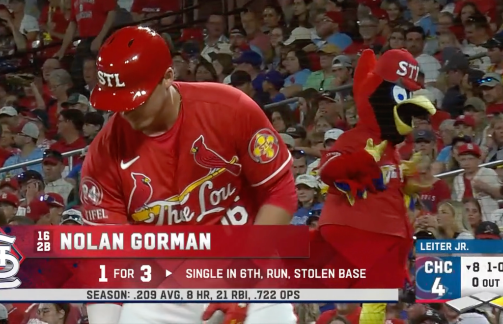 I also wanted to mention Fredbird last night. I got a glimpse in the 8th inning, only got a quick screenshot. See below. The bird has a red cap, red feathers, red jersey. Red on red on red…