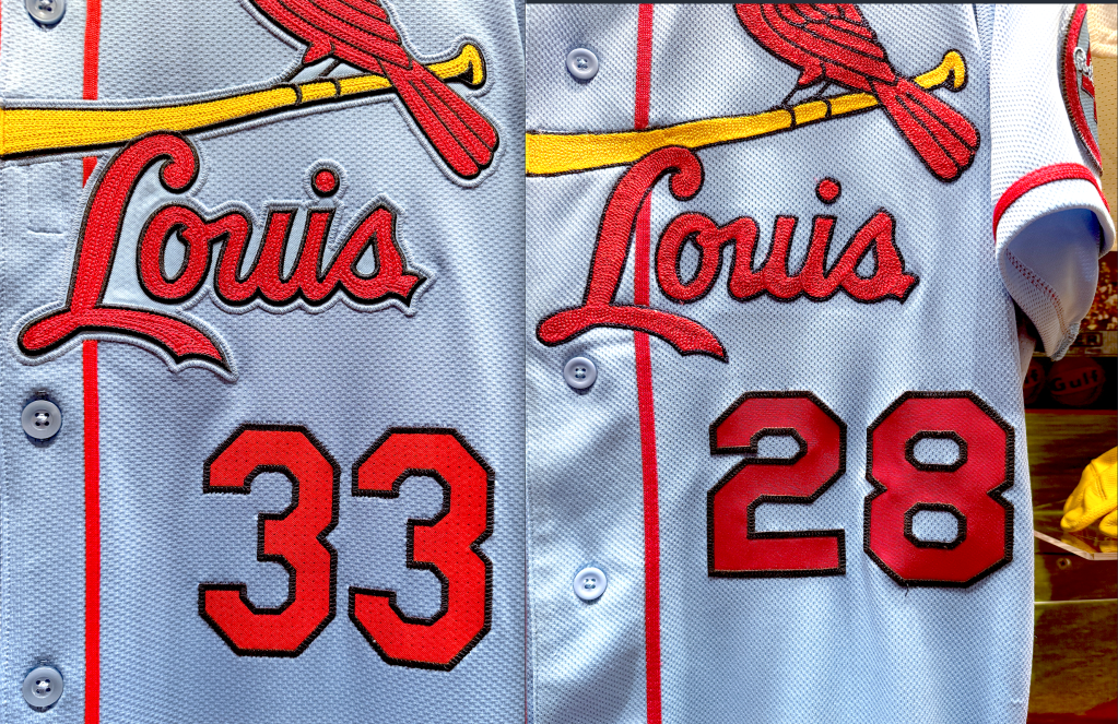 On the left is a 2024 jersey with the new Nike template and what I call The Birds on the Patch. You can clearly see the patch outlines and stitches around the logo, and that it is not directly embroidered into the jersey fabric. Instead it’s embroidered onto a patch and then applied onto the jersey fabric. This causes some visible ugliness and creates a lot of outlines and awkward fill-in areas, notably between the ‘L’ and ‘o’ in ‘Louis.’ The other main difference in this logo application is the navy blue outlines stitching technique. The navy blue threads that outline the Birds, the Bat, and the St. Louis lettering are all done in what is called satin-stitch. This is different than chain-stitch embroidery, and while the satin-stitch does allow for more detail in the logo, it still isn’t chain-stitch, and it breaks the tradition. Beginning in 1922, the Birds on the Bat have always been entirely chain-stitched. We’re talking about 102 years in a row, One Hundred and Two, the Cardinals exclusively used chain-stitched embroidery for the Birds on the Bat. And yes, I’m including 1956 in that number, because in ’56 Sluggerbird on the sleeve was entirely chain-stitched! It is a true travesty that Nike wanted to get rid of our tradition, so give some credit to Bill DeWitt III who fought for keeping chain-stitch embroidery to apply the red and yellow portions of the logo.