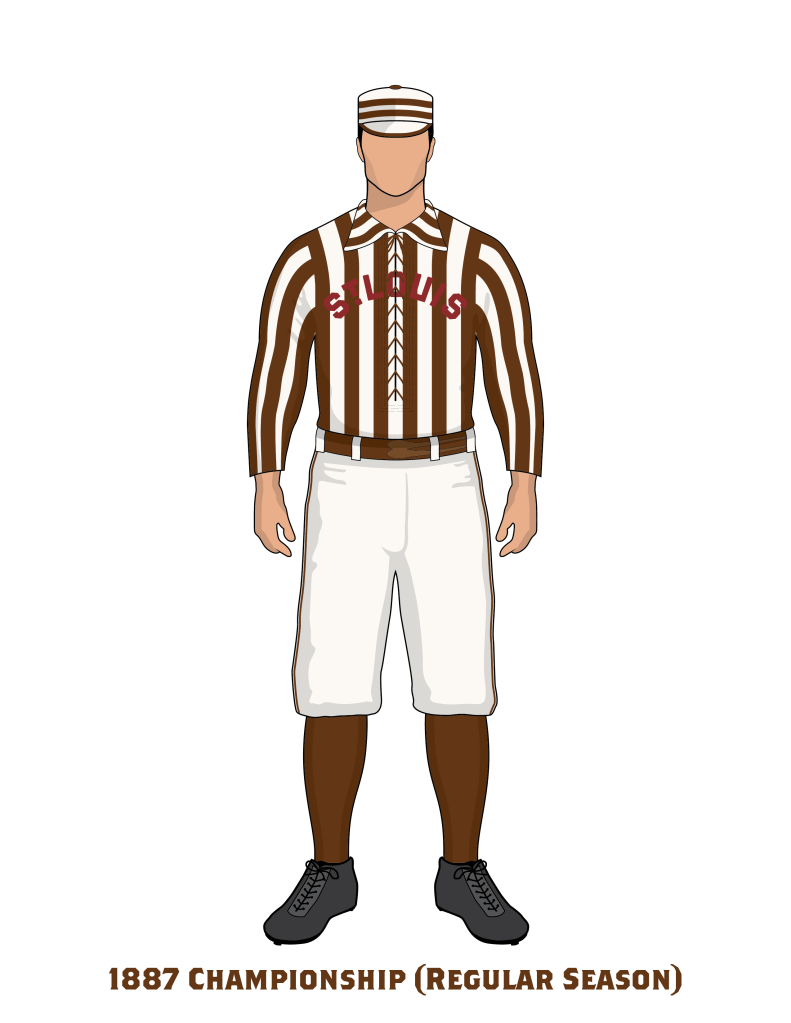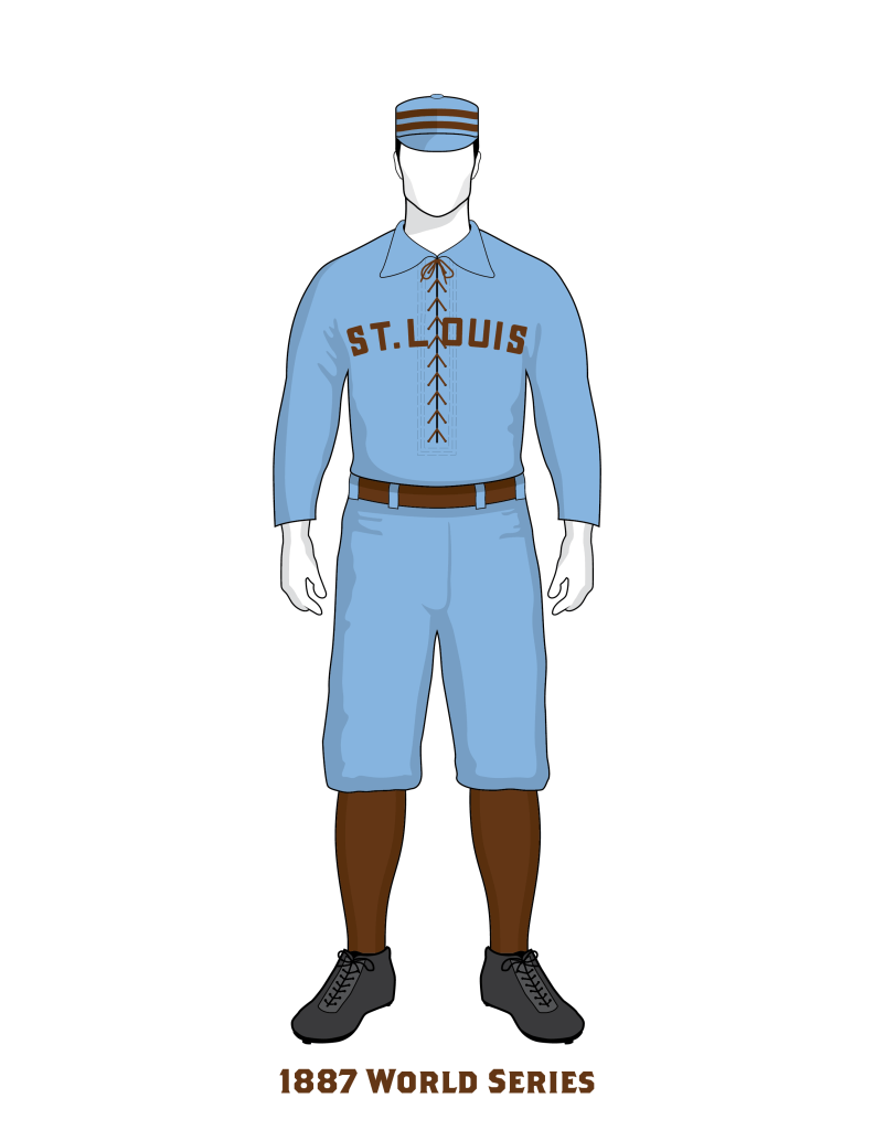 In 1887 the Browns wore four uniforms, all radically different from each other. The primary uniforms had vertical brown referee style stripes. The “exhibition kit” uniforms were likely a dark blue with maroon lettering on the chest. The alternate uniform appears in baseball cards from the era showing maroon or red shirts, but we believe it was more of a brown color than maroon. And the World Series uniforms were a light blue or a sky blue with St. Louis lettering on the chest.