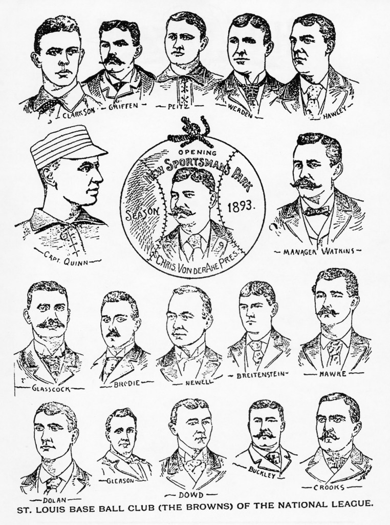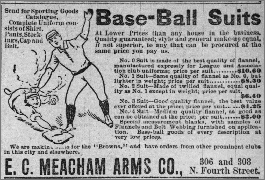 The Browns’ new uniforms reached Sportsman’s Park yesterday. They were made by the E. C. Meacham Arms Co., and present a fine appearance. The pants and shirts are of blue, and the words, “St. Louis Browns” are across the shirts in white letters. The stockings, belts and caps are brown.