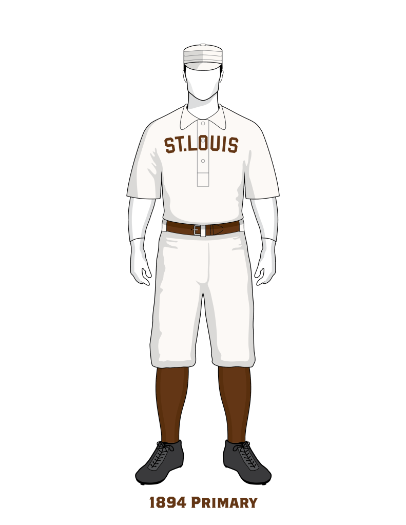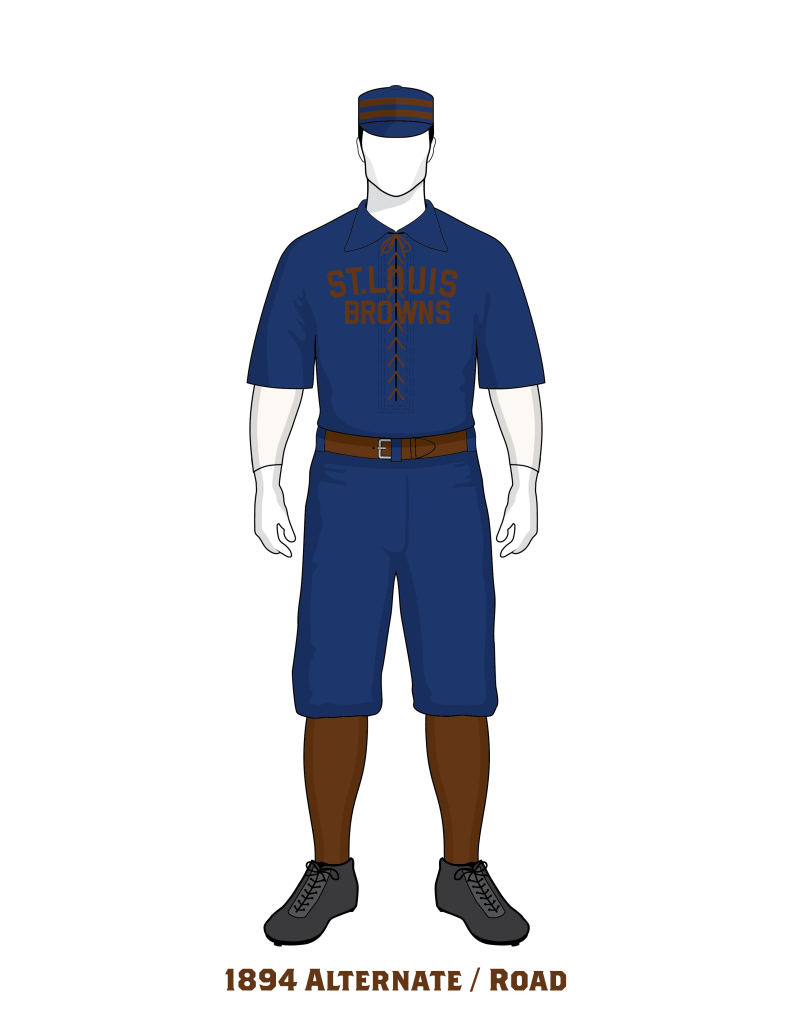 The Browns have announced their selection of ’94 uniforms. At home they will wear white with brown trimmings. On the road, blue flannel shirts and pants, with brown trimmings and the name, “St. Louis Browns,” across the shirt front. The cap is of blue, with brown trimmings, and the belt and stockings are brown.