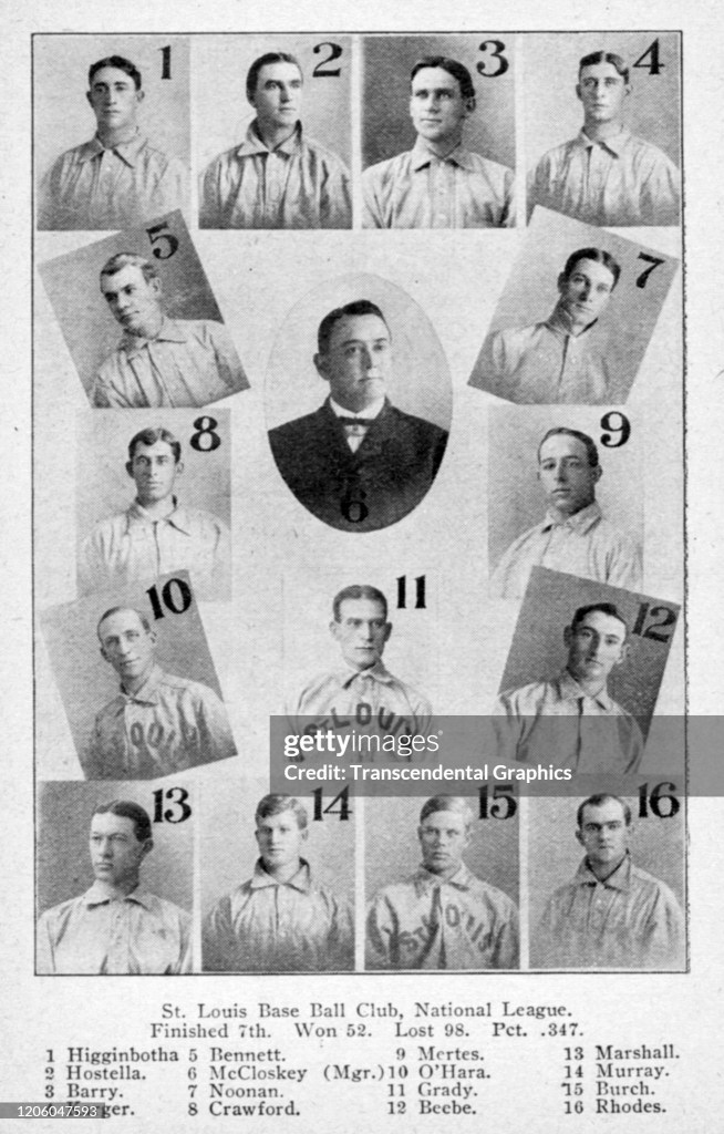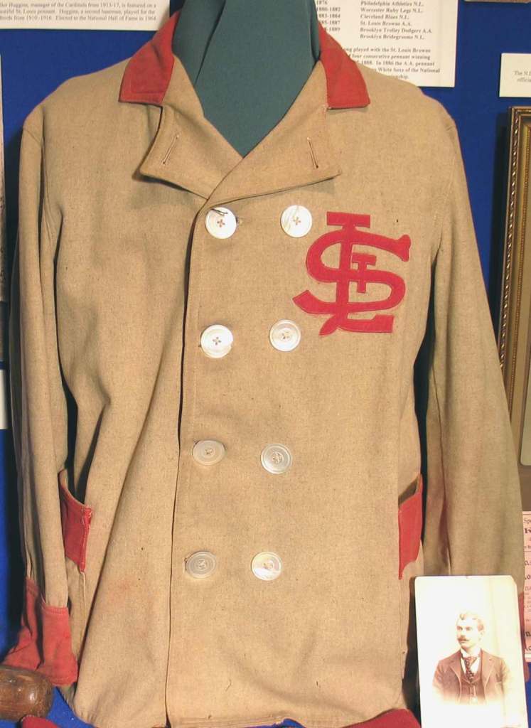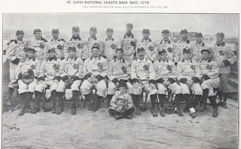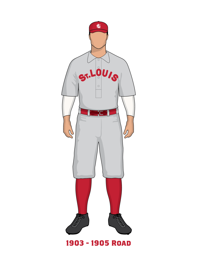 1903 through 1906 appeared to have the same uniforms. The only change noticed is the emblem on the cap, which was a new design that also incorporated a T in the emblem, reading STL. We also saw this emblem used on team overcoat jackets. In this era, we see photographs of the entire team wearing jackets with STL emblems on them. Sometimes this emblem matched the emblem on the cap, and sometimes it did not.