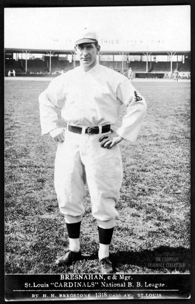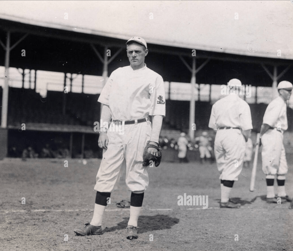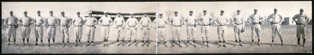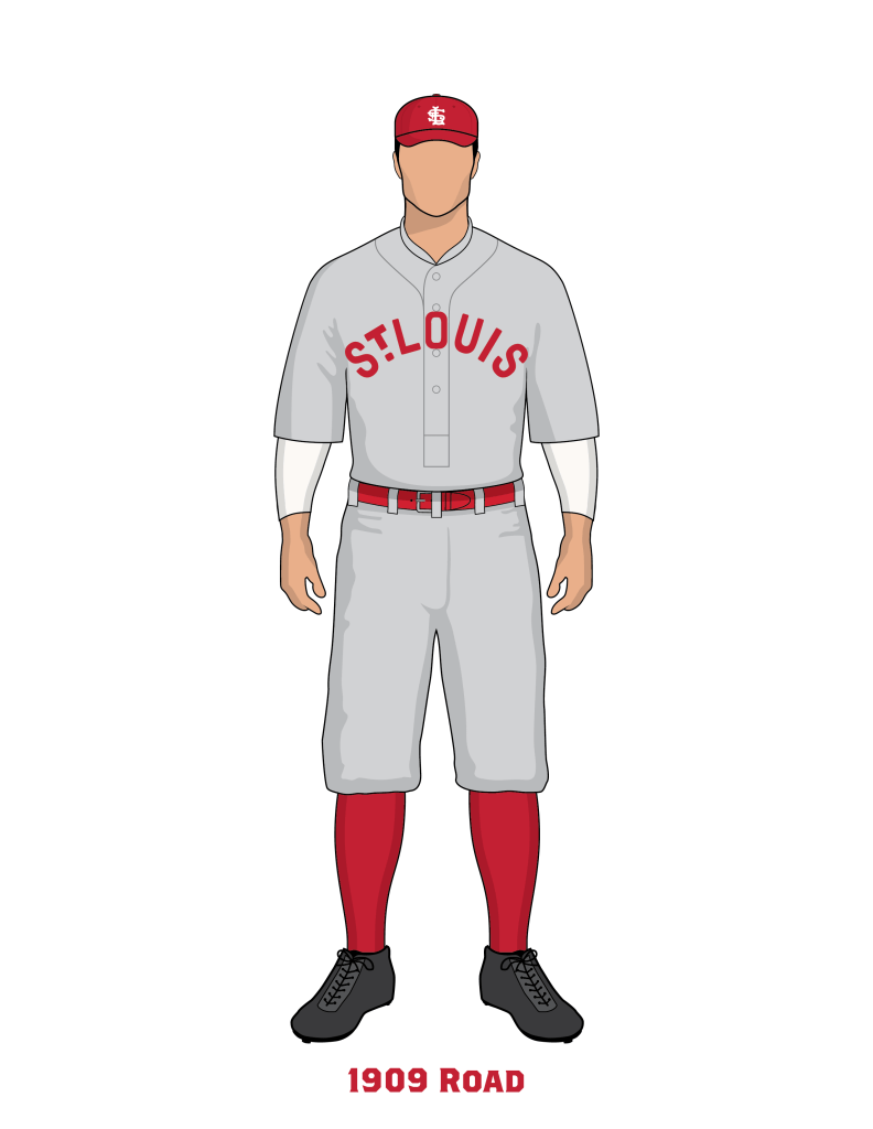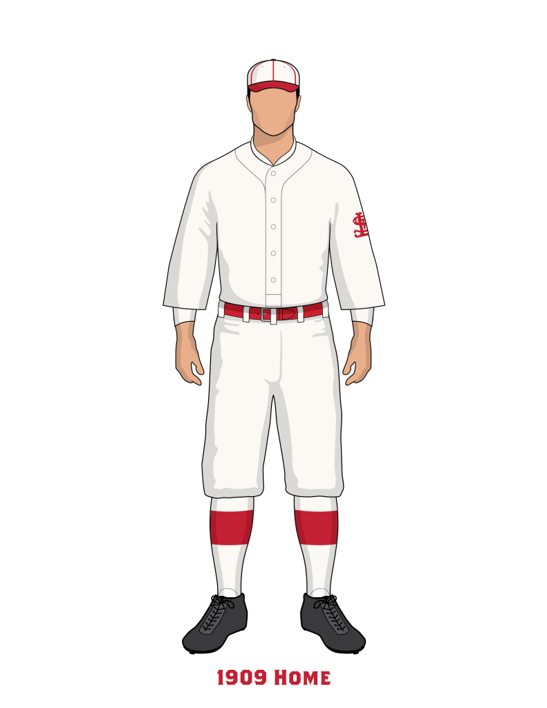 1909 began a period of monotony. The team changed jersey styles, opting to wear plain white uniforms with nothing across the chest. Their only identifying mark would be a new STL emblem, in red, embroidered on the left sleeve. The jerseys also switched from classic shirt collars to a small skinny collar called Sun Collars. This uniform design would last for 7 years. We have a large collection of baseball cards from this era that are mostly hand drawn, and based on photographs. The artist chose to give the team gray uniforms, with red collars, and red piping. We do not think these drawings are accurate and do not match what the team wore on the field.