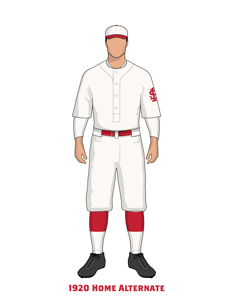 The 1920 Cardinals returned to wearing ST. LOUIS across the chest. An alternate jersey is shown, nearly identical to that of the the 1917 jersey. We see this uniform shown in 1921 Spring Training photos. Teams typically wore previous season’s uniforms for Spring Training before getting their new uniforms on Opening Day. Often times old major league uniforms were passed down to minor league players in camp. While we can clearly see this SL patch uniform in photos, we do not know how it was used, or if it used at all in the regular season. Photos from this season are scarce.