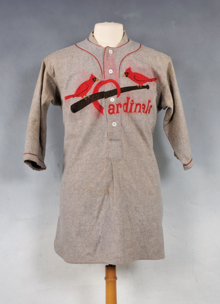 Is this jersey a very convincing fake? This jersey went up for auction years ago, labeled as an early 20s Cardinals road jersey. The auction was withdrawn because its authenticity went into question. The glaring issue from this jersey is that it doesn’t have pinstripes. The other issue is that it has no player tag sewn into the shirt. Perhaps this was created as a sample in 1924, 1925, or 1926, and never made it to the playing field. Perhaps it was made for an offseason barnstorming tour?