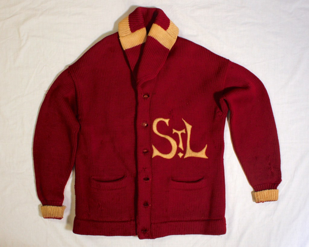 A 1926 Warm-up sweater worn by Jesse Haines. The sweater has cream trim at the cuffs and at the shoulders of the shawl collar. A cream wool felt “STL” adorns the left chest.