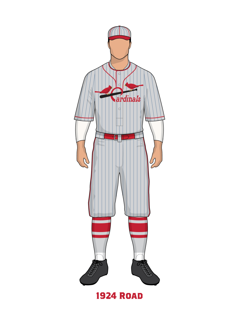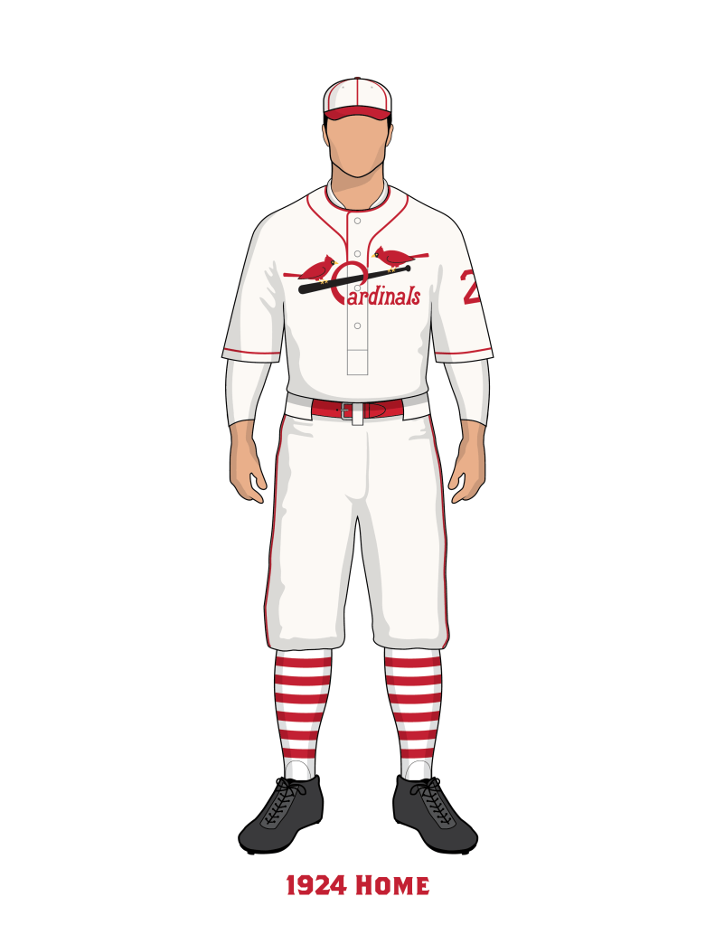 In 1924 the Birds on the Bat were tweaked again, and featured new birds and new lettering. Notably the C in Cardinals was rendered very large with a radical swooping shape. Despite Branch Rickey’s claim of how much ridicule the team faced over their sleeve numbers, we continue to see the numbers in the photographic record from 1924. We show the numbers in red for 1924, but there is a possibility they could have been black as they were in 1923. We see a new stripe pattern on the road socks. We do not know the exact colors of the sock striping.