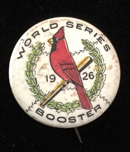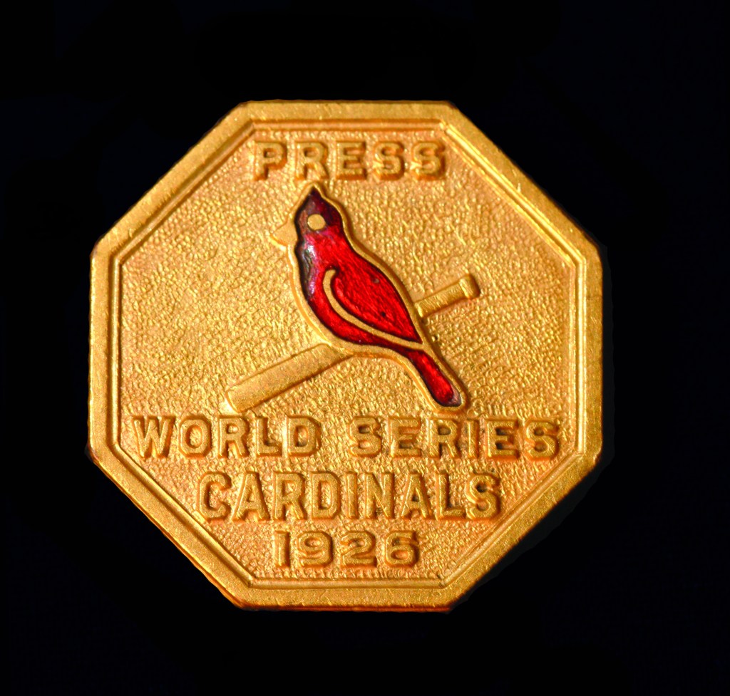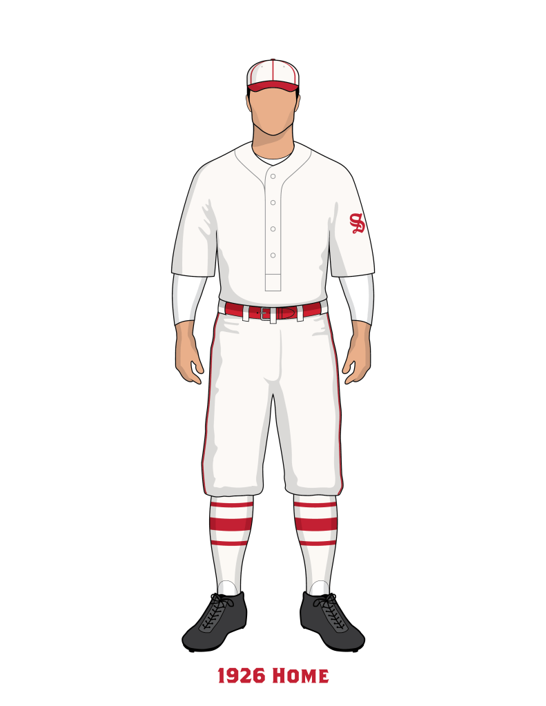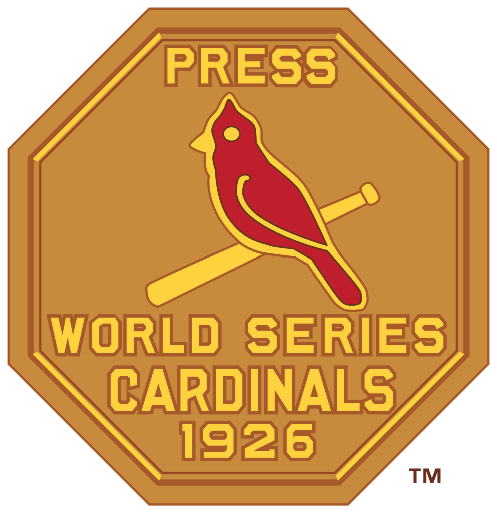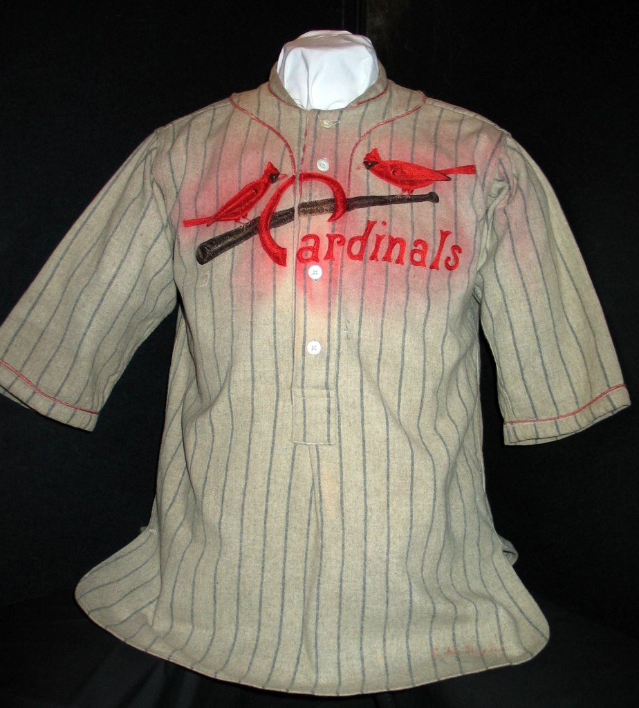 In 1926 the Cardinals home uniform went to a more “old school” look. The only identifying mark was what we refer to as the STM logo, a Blackletter or Old English emblem that made the L look like an M. The Cardinals have a physical sample of this jersey displayed in their museum.