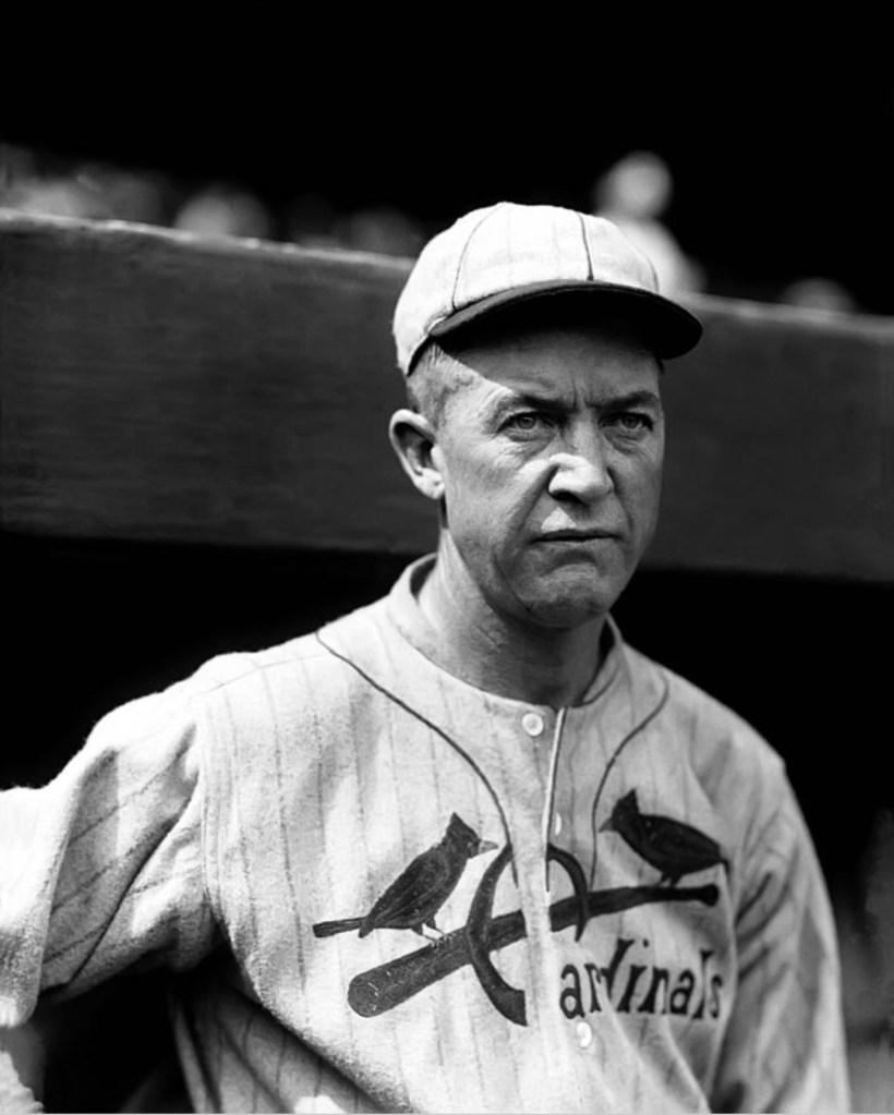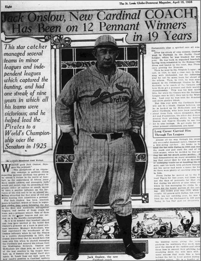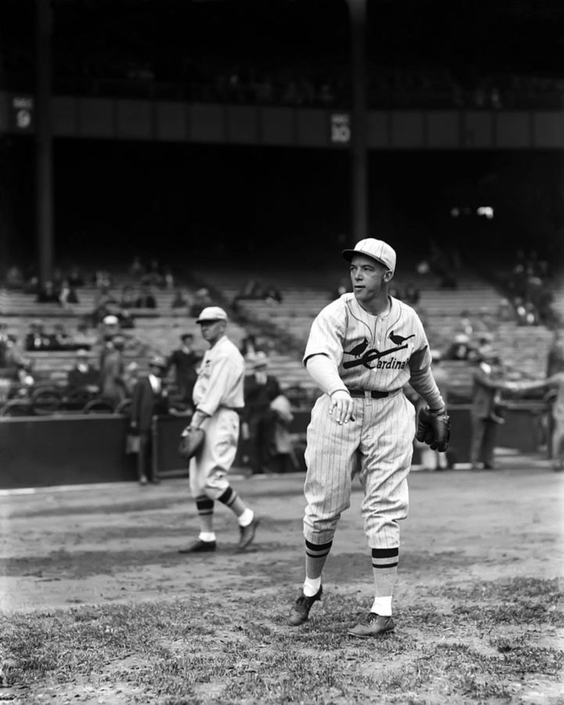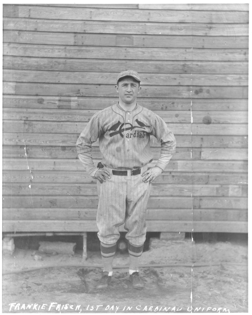 An automobile parade through the St. Louis downtown district last Wednesday afternoon preceded the shipment by express from St. Louis to New York of the new uniforms of the Cardinals to be worn by them during the world series games. The uniforms, made by the Leacock Sporting Goods Company, which has made the previous uniforms of the club, were carried in a Cylinder Straight Eight cardinal colored touring car driven by Fred W. Gardner, vice president of the Gardner Motor Company Inc. The car was photographed in front of the Leacock company’s building at 921 Locust Street before the start. Fred Gardner is at the wheel, and beside him sits R. J. Leacock, president of the Leacock Sporting Goods Company. Two giant cardinal birds decorated the car, one at the windshield, the other on the radiator, and a big pennant mounted above the hood, bearing the inscription, On to New York to Beat the Yanks. The Gardners carried the uniforms to Union Station where they were delivered to the Adams Express Company, leaving at 4pm for New York. The express company provided a man to take charge of the uniforms and deliver them personally to Rogers Hornsby in time for the first world series game at the Polo Grounds. The uniforms are the same as the road uniforms made by Leacock for the St. Louis National League during the past year. They are steel gray with dark green stripes. Two cardinal birds and a baseball bat are embroidered in silk on the shirt. The cap has a cardinal visor. The stockings are gray with a center stripe of cardinal and two green stripes. The belts are cardinal in color. The shipment consisted of thirty-one complete road uniforms, including the 15 year-old size for the “Good Luck Sullivan”, the Cardinals bat boy. The at-home uniforms are of white with cardinal trimmings, cardinal belt. the monogram St. L on the left sleeve, and the white stockings with three narrow cardinal stripes.