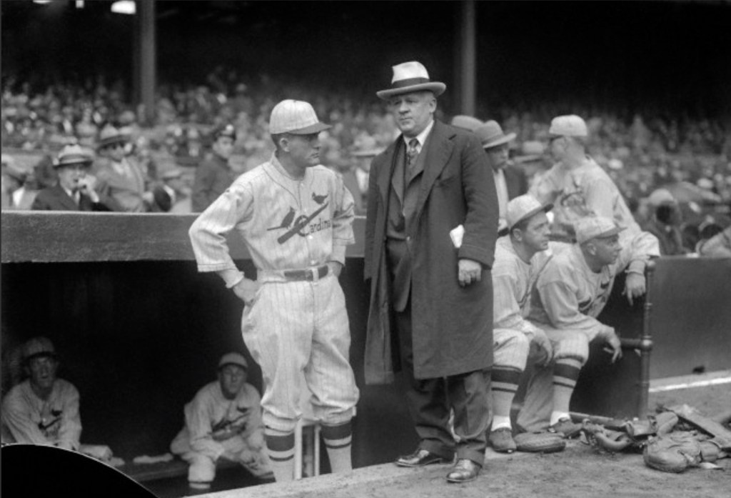 The proper color of the day was cardinal or a brilliant red, and with thousands of women in the stand wearing red bonnets, the picture was a gay one, and gayer still when the rain came on and the girls put on their prismatic slickers. Everywhere in the great green stands was the cardinal “bird,” which is expected to become the national bird if the Cardinals win the series. The red birds seemed to be everywhere except on the pristine uniforms of the St. Louis players themselves, these were only adorned by the club’s initials in red on the left sleeve and a red visor to the cap.