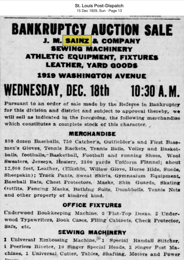 Jose Maria Sainz was born in San Dimas, Mexico in 1889 and was well educated as a youth. He and a friend journeyed north in 1908 from the State of Durango to St. Louis, MO by train to seek university schooling. They both fell upon hard economic times and could not pay for their schooling and became homeless and destitute. Jose worked odd jobs as a day laborer and eventually found steady work as a furnace room keeper at Rawlings Sporting Goods. He slept in the furnace room as well. He married in 1914 and had saved enough money to rent an apartment. He was constantly ridiculed at Rawlings for his Mexican heritage and had many fights with other employees. At his wife’s urging, he quit Rawlings in 1916 and started work at Robert-Johnson-Rand, a shoe manufacturer. The machinery there was quite different from Rawlings and Jose struggled mightily to avoid being fired for costly mistakes. Disheartened, Jose applied for a job as an apprentice at Commonwealth Steel Co. as a machinist. He found a measure of success there and rose to foreman and Steel Workers Union representative. However, when the Armistice was signed ending WWI in 1918, Commonwealth started to lay off employees and Jose was one of the unfortunate ones. He had saved enough money to enter business school in 1919, and upon graduating, went back to work at RJR Shoe Co. with the idea of expanding their market into the Hispanic community. The job was so low paying however that in 1922 he jumped at the chance when Rawlings offered him a similar job at double the pay. He was to be an outside sales representative to the Hispanic community in the U.S. and Mexico. He was also to design Rawlings catalogs and literature in Spanish. He traveled extensively in Mexico and was highly successful. He was on a management track at Rawlings and his future looked bright but his marriage was disintegrating. Jose took offense to a comment by an executive at Rawlings regarding his personal life and punches were thrown. Jose was immediately fired. He was nothing if not resilient and took this as an opportunity to start his own company, J.M. Sainz & Co. He designed the crest of his trademark logo incorporating the words, “The Sunshine Line.” This was in tribute to the Sunshine Special, the Missouri Pacific Railway train he used when coming north in 1908. He contracted with three companies, RJR Shoe Co., Mexican American Hat Co. and oddly enough Rawlings (personal grievances were set aside for the sake of business). Marketed under the J.M. Sainz Brand, Jose left for Mexico in 1923 to sell his goods to an eager populace. He became wealthy and bought huge plots of land in Mexico. He met and interacted with political figures and gained influential contracts. Disaster struck in 1926 when a large shipment from Rawlings turned out to be faulty. Jose lost some of his reputation in Mexico because of this and really raised his ire when Rawlings would not settle up with the damaged merchandise. Jose won a lawsuit against Rawlings in court for real and punitive damages. At this point, Jose decided to teach Rawlings a lesson and in 1927 he leased a factory on Washington Street in St. Louis and hired away many Rawlings employees and went head to head against the larger company. He sought the friendship of Judge Landis, the Baseball Commissioner and Sam Breadon, the owner of the St. Louis Cardinals. Jose was able to obtain some contracts with the St. Louis club and traveled extensively in the Midwest marketing his sporting goods. In the end, he was destined for failure against the bigger company and J.M. Sainz & Co. closed in 1931. Because of his extensive land holdings in Mexico, Jose was able to retire to the good life down south and raised horses.