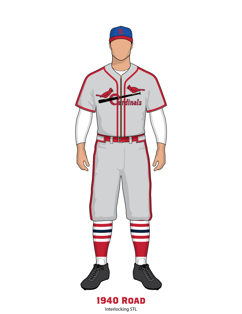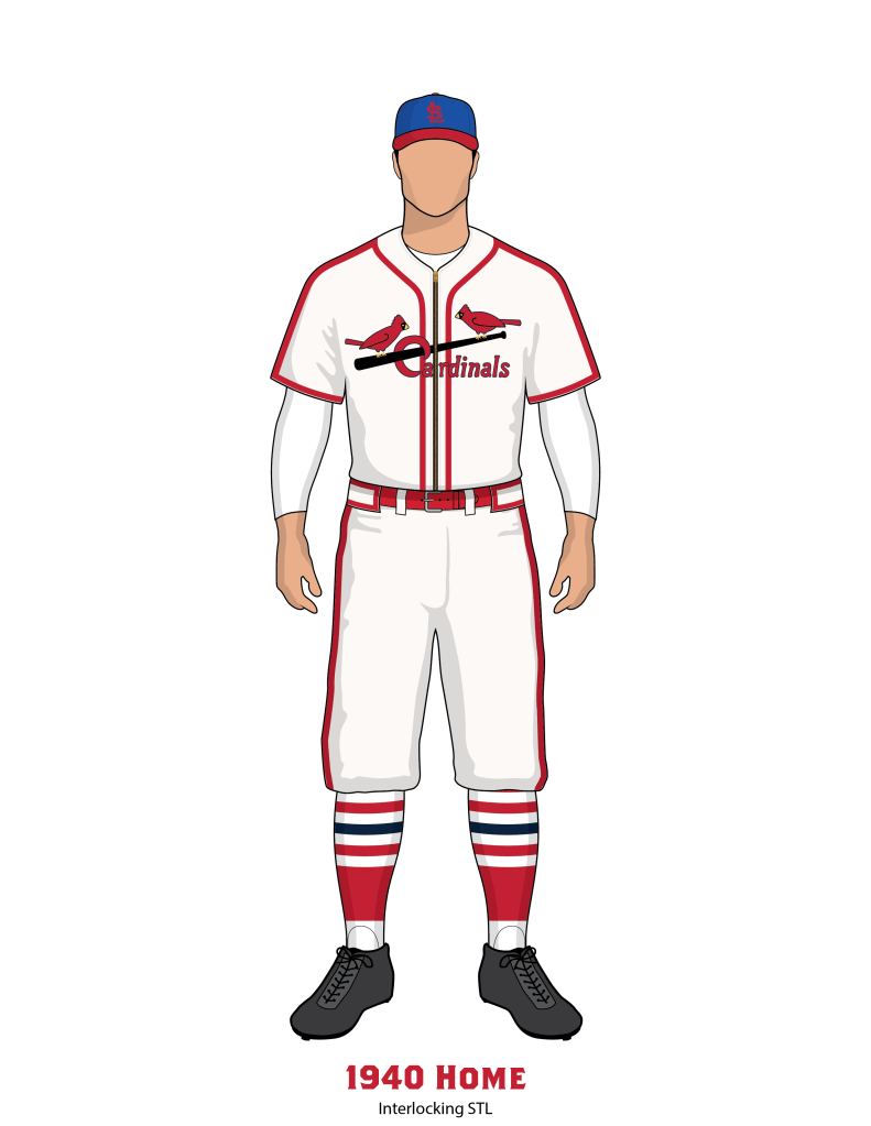 The 1940 uniforms featured brand new two-tone hats, the first time wearing blue caps since 1919. There were two different caps, one with an interlocking STL emblem, the other with a block STL featuring an exclamation (!) T. Both cap emblems were applied as a felt patch. We don’t exactly know how each cap was used. Black and white photography in this season proved very tricky for us. Many photos make it seem like the caps were actually red with a blue emblem. See below for much more in depth information provided by Phil Hecken and Gary Chanko.