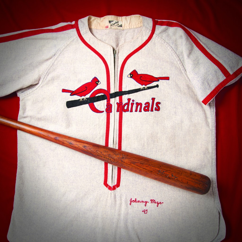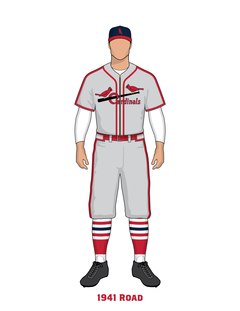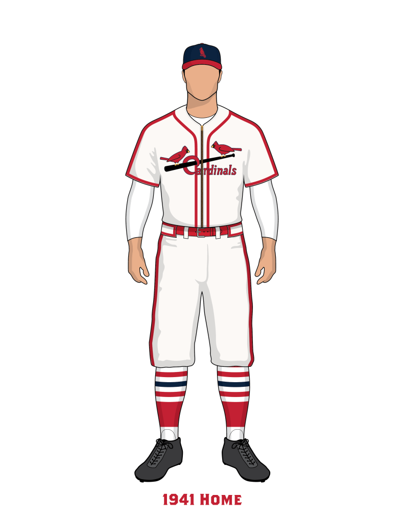 The 1941 uniform was identical to 1940, with the exception of the cap. For the first time ever the Cardinals cap would show a bird. The bird was chain stitched on a red felt patch, This cap would last for only one season, and a bird would not return to the cap until 1998.