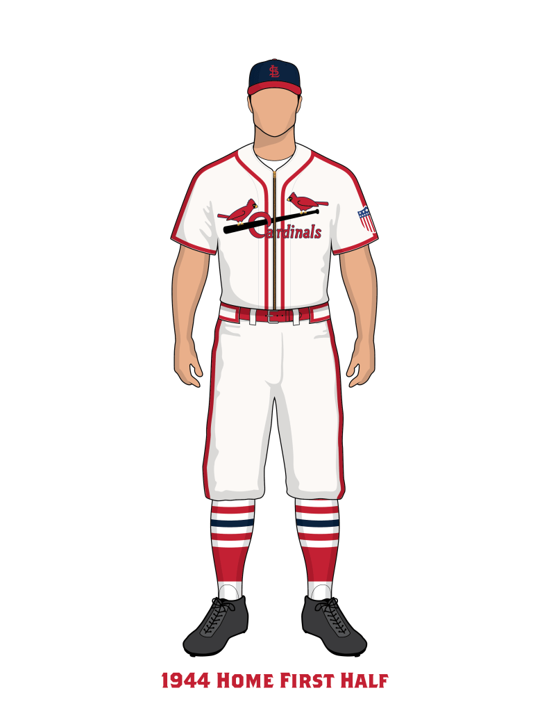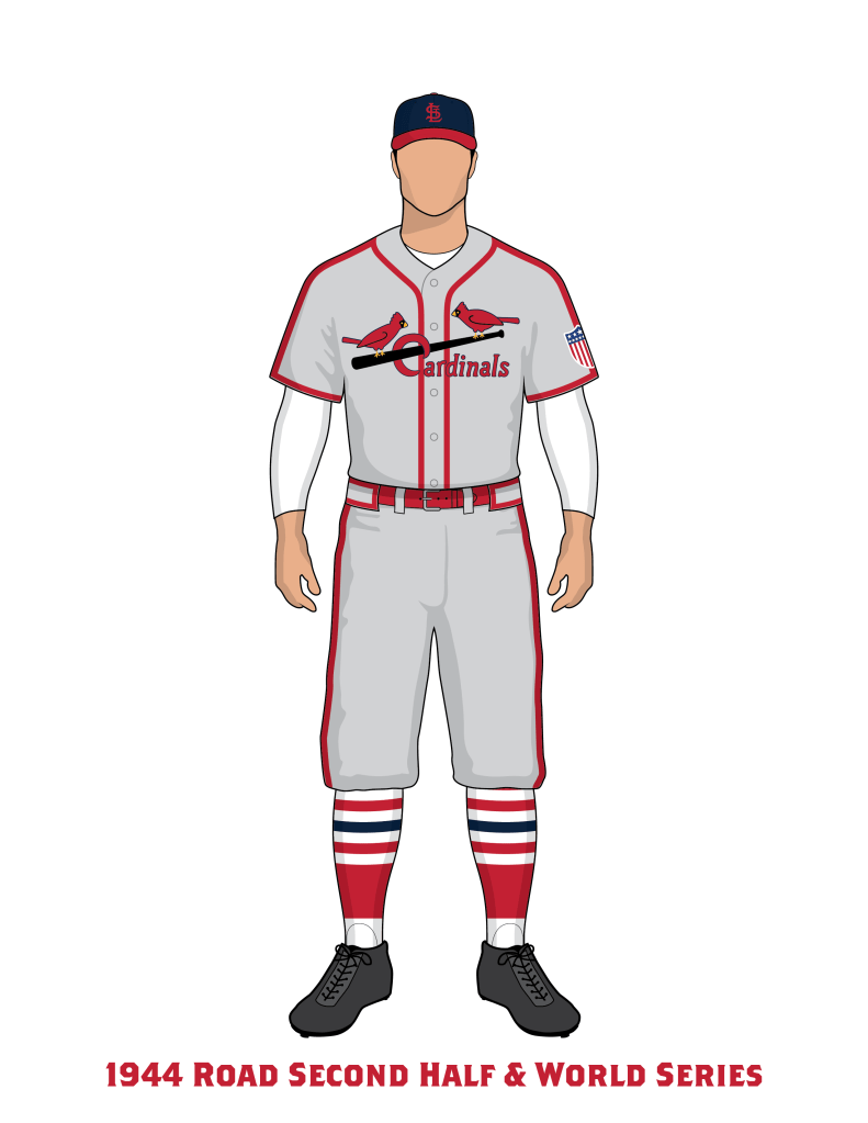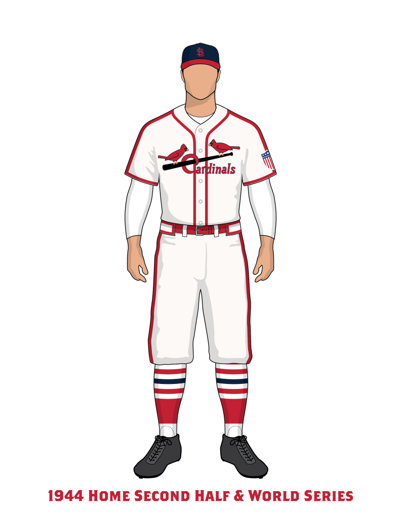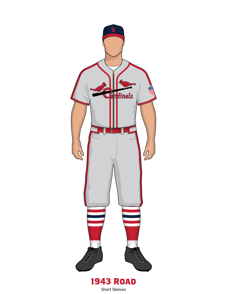 In 1943 the Cardinals kept the same uniforms, but their sleeve patch was now a shield that featured stars and stripes. This patch was worn recognizing America’s involvement in World War II.