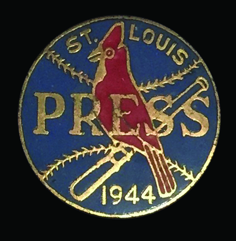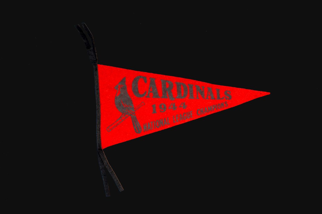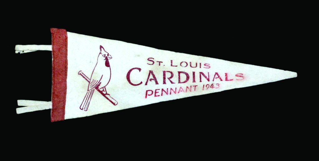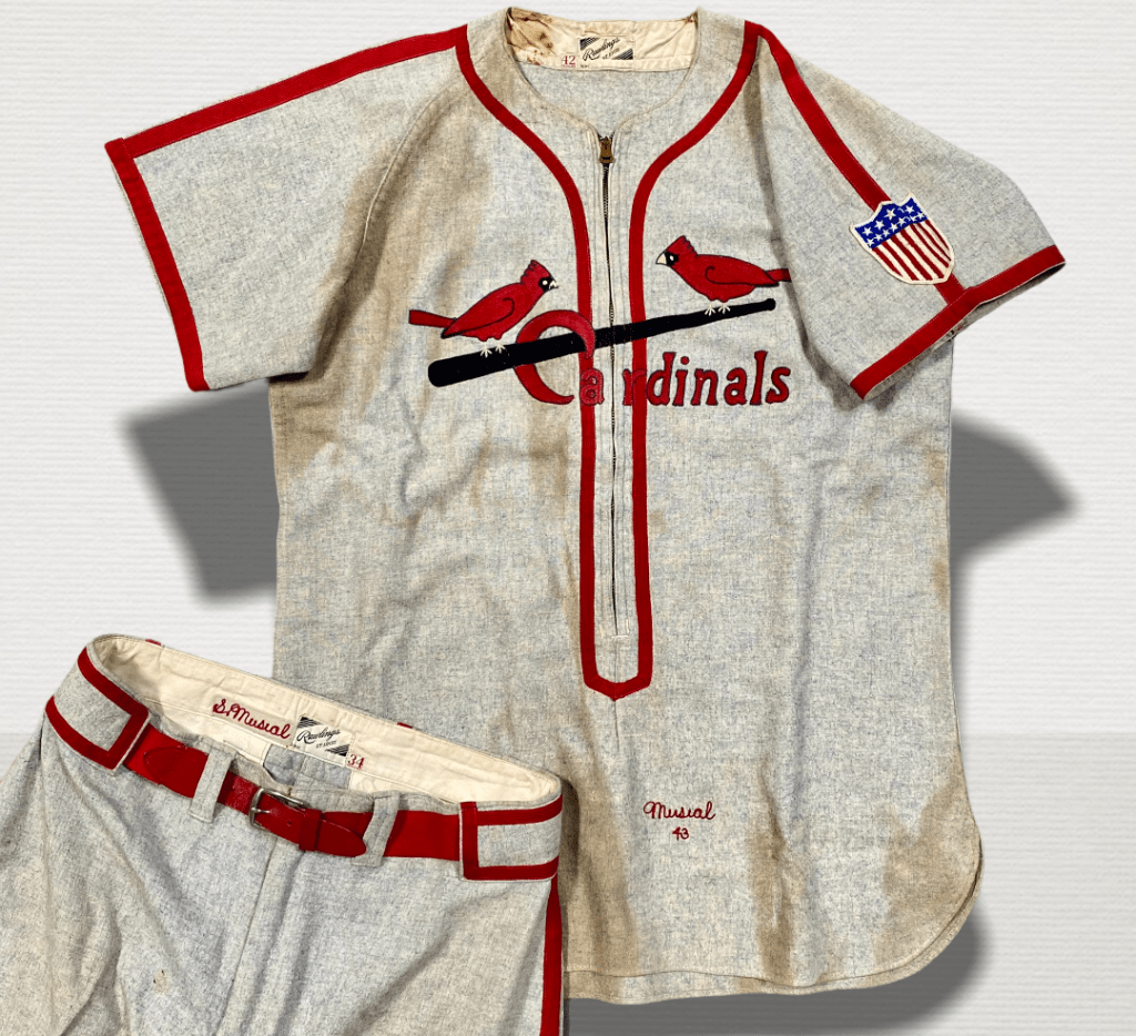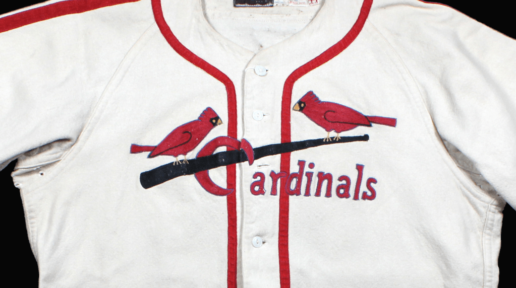 In 1943 the Cardinals kept the same uniforms, but their sleeve patch was now a shield that featured stars and stripes. This patch was worn recognizing America’s involvement in World War II.