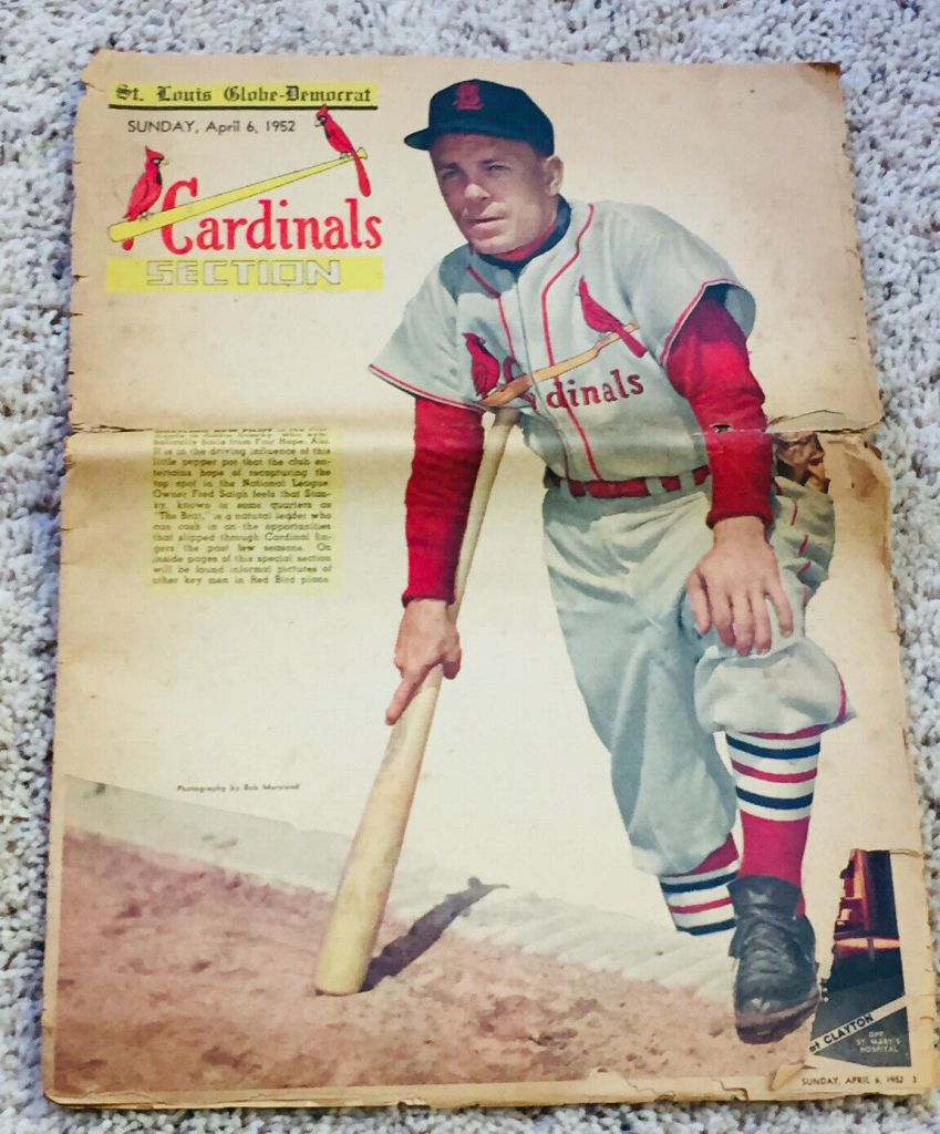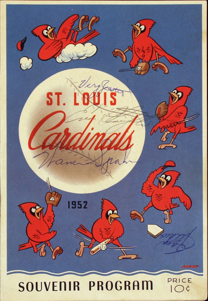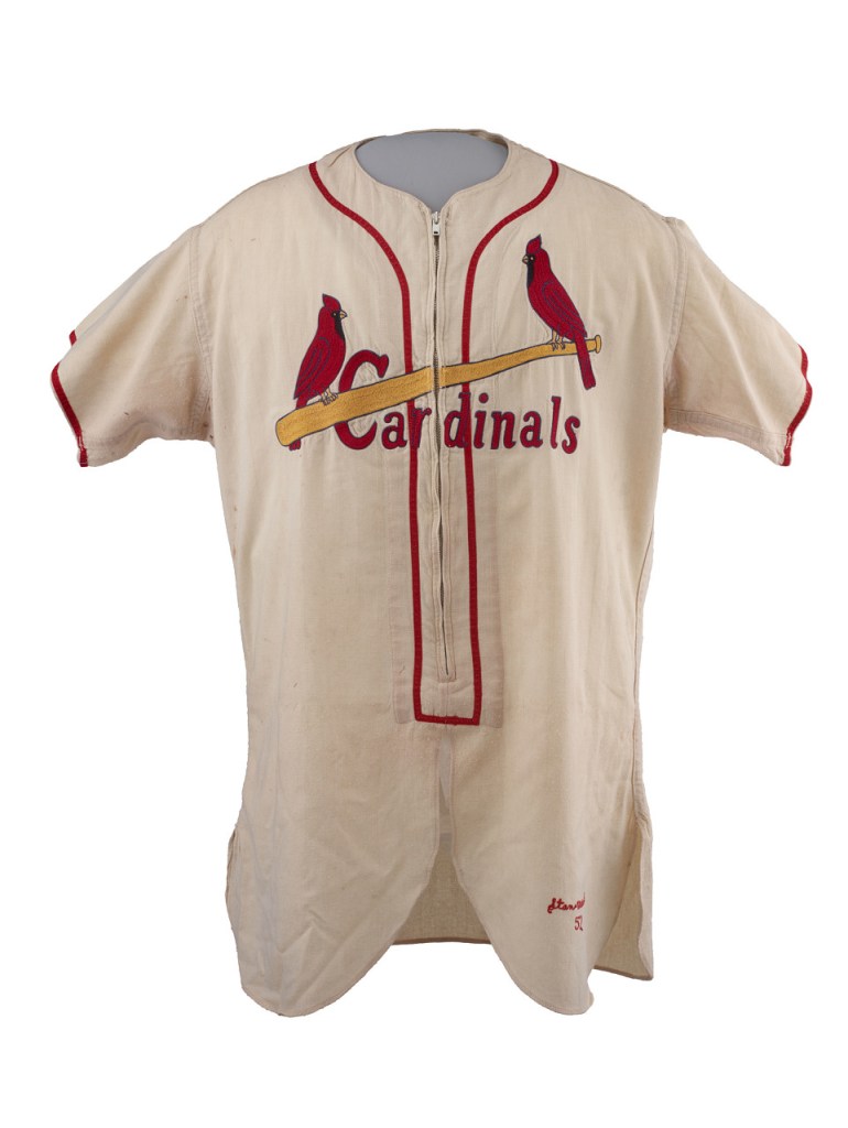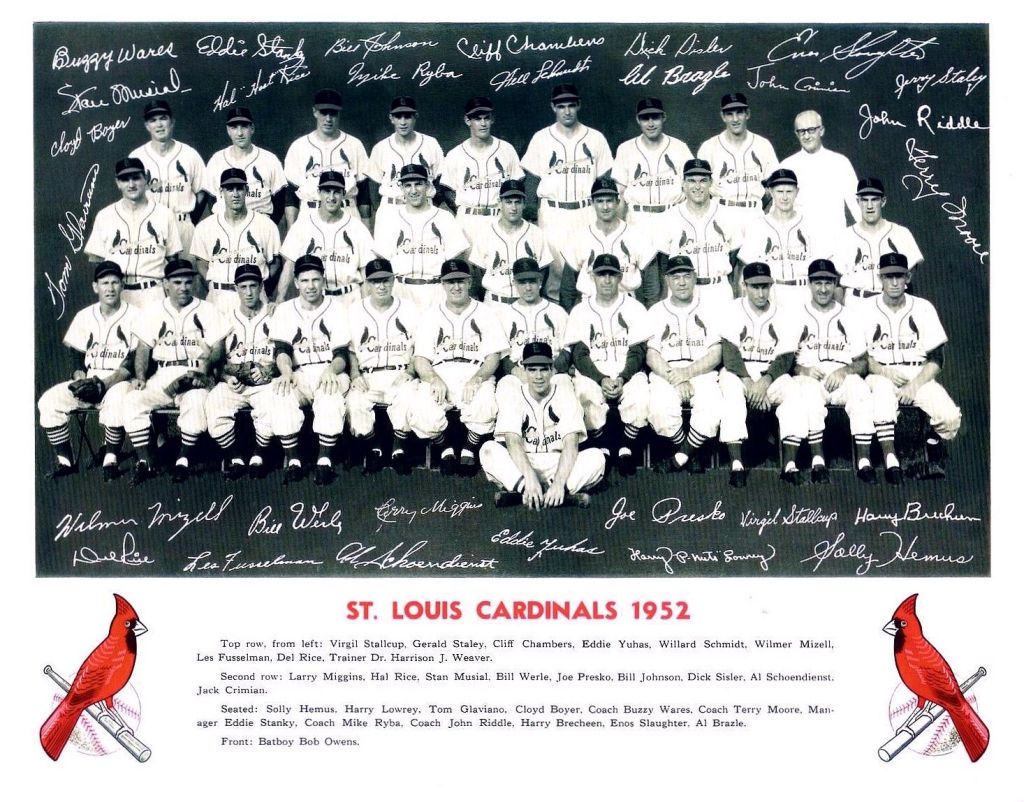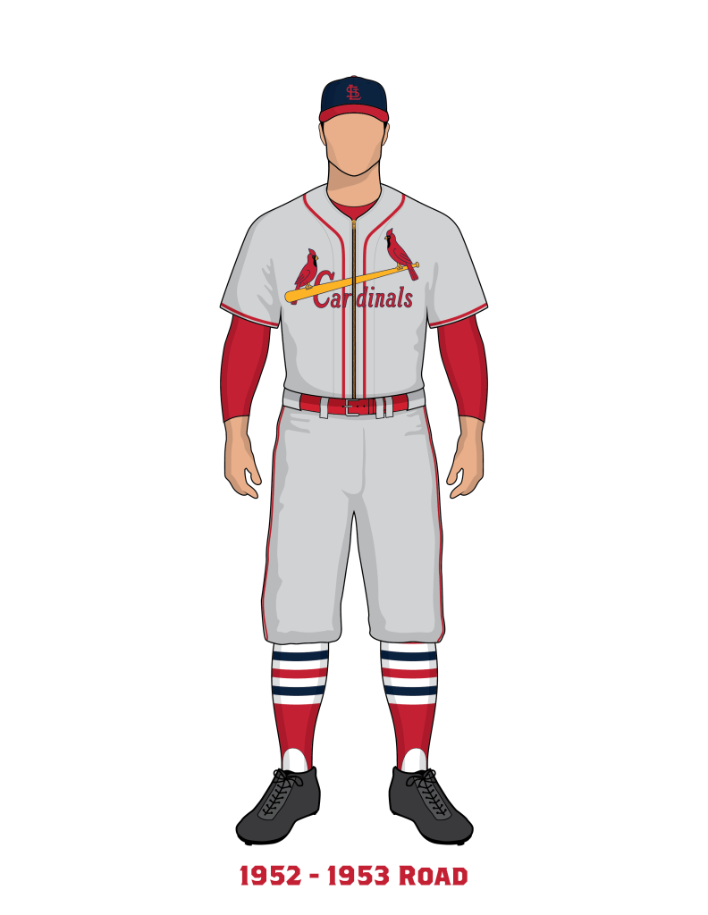 In 1952, the Cardinals kept the same jerseys, but dropped the National League sleeve patch. The team also switched back to a two-tone cap.