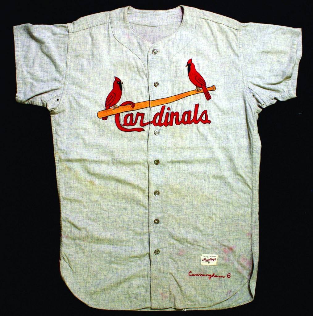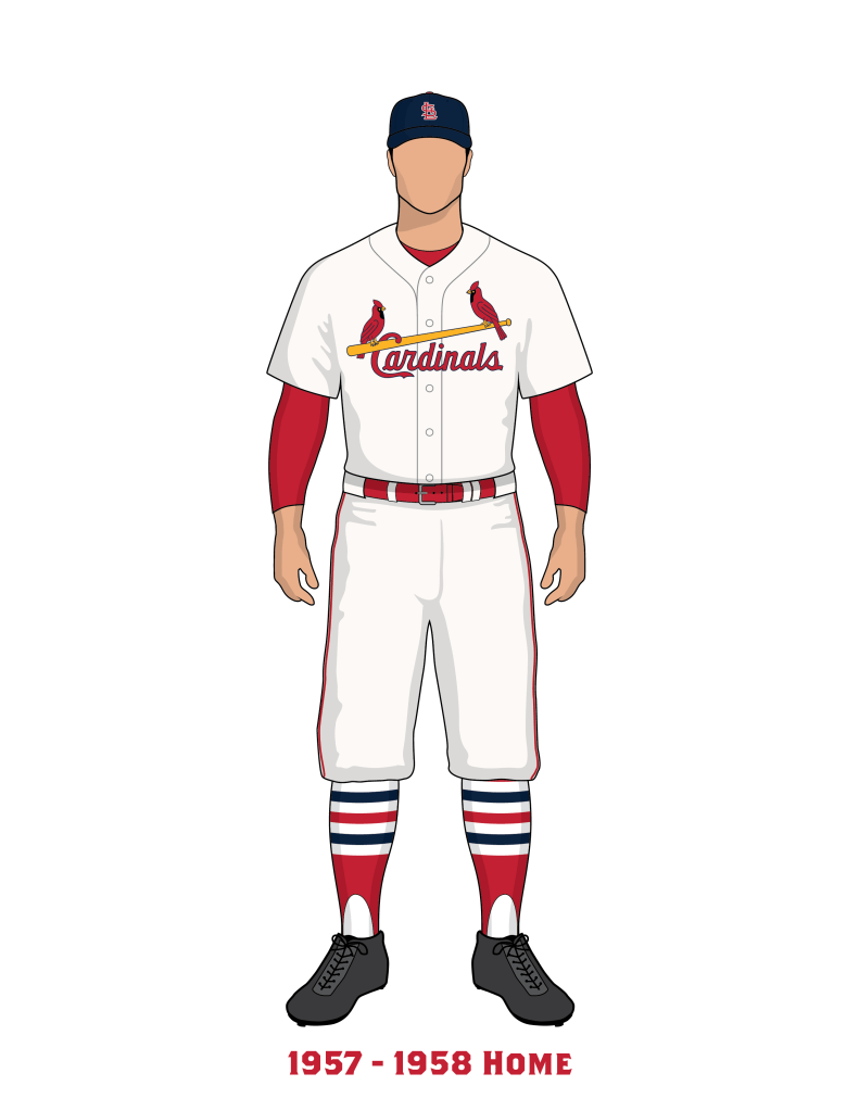 Only the shirt will be changed from the 1956 uniform, with the addition of two red birds perched on a gold bat and entwined in the word “Cardinals.”