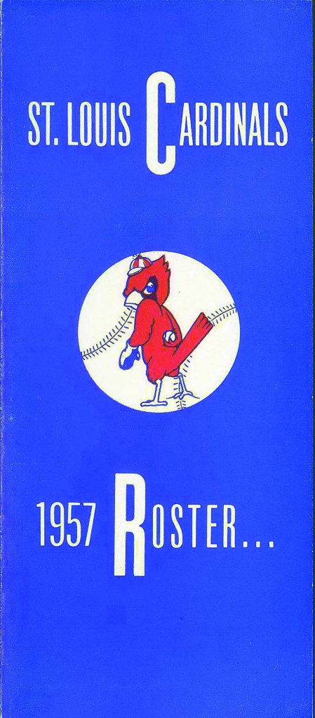 The 1957 Cardinals restored the familiar Birds on the Bat to their jerseys. These birds resemble the design from ’51-’55, but were rendered smaller, and have slightly different details in the face, eyes, and wings. In 1957 and 1958, the Cardinals continued to be a “blue team” on the road, wearing the same blue undersleeves and blue socks from the 1956 road kit. But in 1959 their road socks and sleeves were back to red.