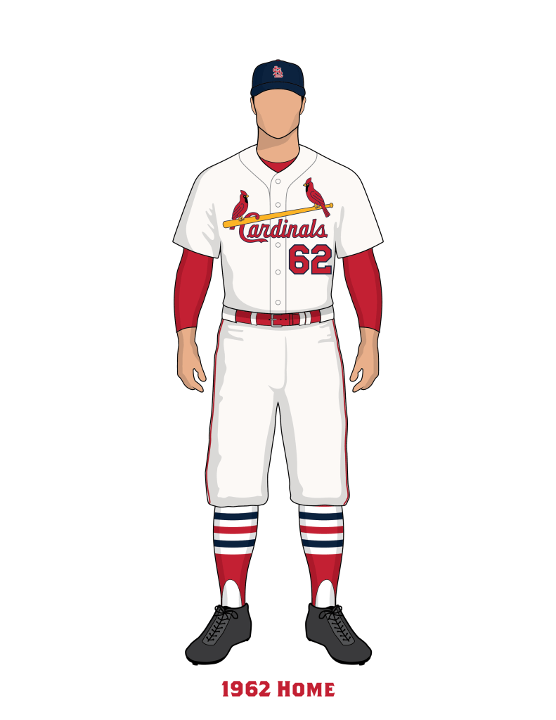 In 1962 the Cardinals added numbers to the front of their jerseys and names to the back of the jersey. The uniform was otherwise unchanged.