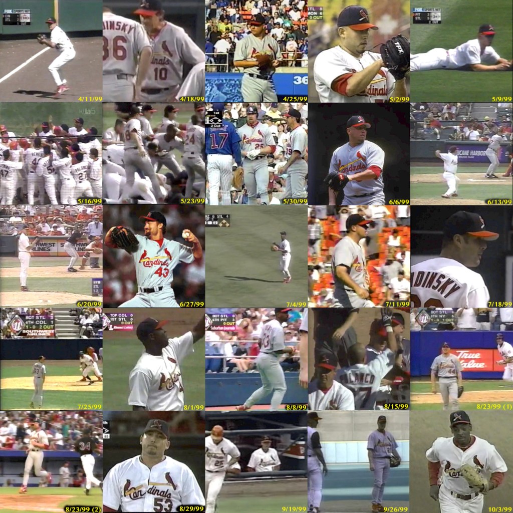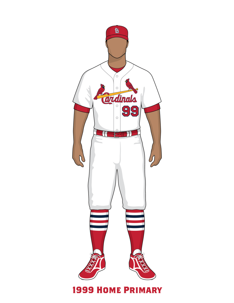 As pointed out by reader Elias Coblentz on the 1998 page, it would appear the Cardinals wore their Sunday caps for all Sunday games, home and road in 1999. This would only last this one season, and in 2000 it would become only a Sunday Home cap.