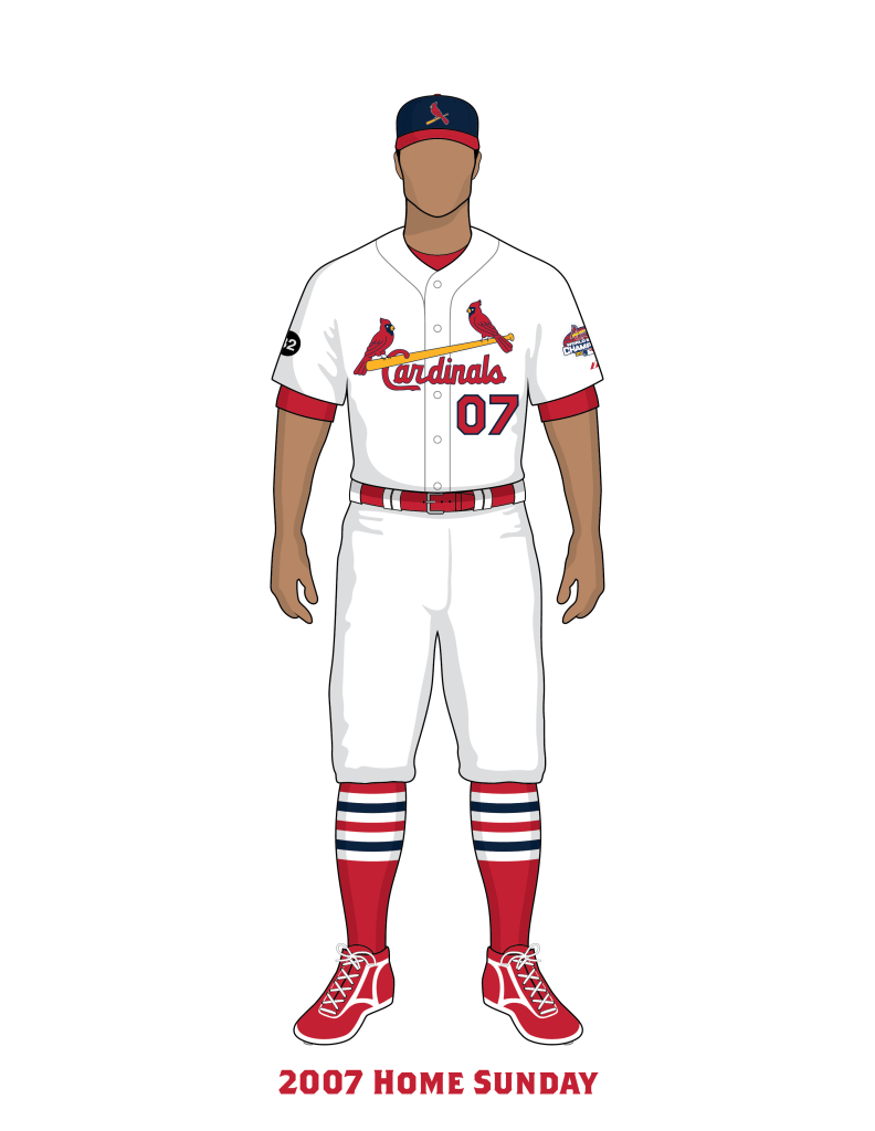 In 2007 for the opening series in St. Louis, the Cardinals wore gold trimmed uniforms. The uniform numbers, letters, and the World Series Champions sleeve patch had a gold trim on it. The World Champions logo for the opening series was worn on both the cap and the sleeve. Throughout the season the World Series Champions patch was only worn on the home uniform.