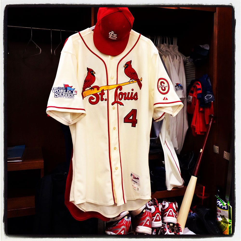 When the St. Louis Cardinals take the field for Game 3 of the World Series against the Boston Red Sox, they will wear their cream-colored Saturday alternate jerseys, with St. Louis across the chest. In Game 4, they will wear their Sunday navy cap, with a red brim and the logo of a bird on a bat. On Monday, in Game 5, they will wear their usual home combination: primary white jersey, primary red cap.