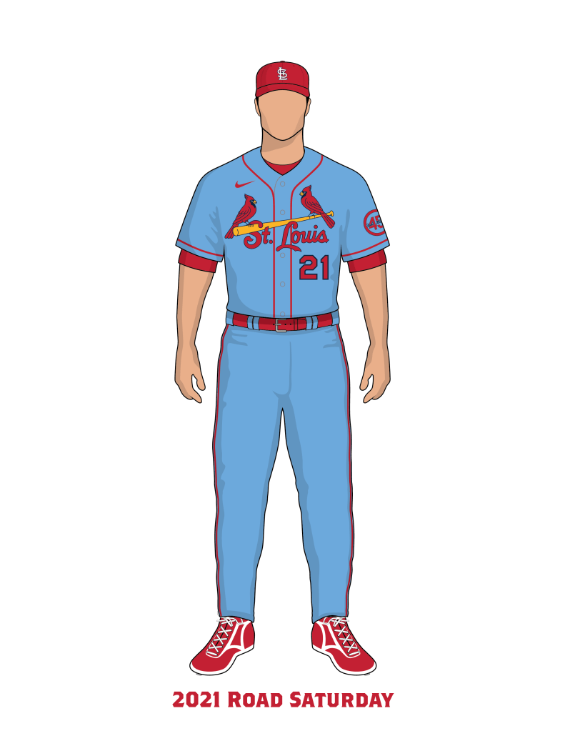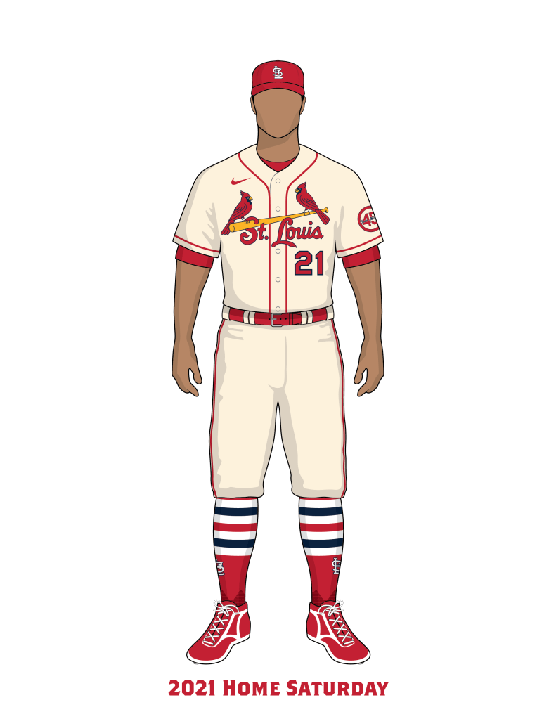 In 2021 the Cardinals continued to wear their 6 uniform kits, and added Bob Gibson memorial sleeve patches with a 45 and Bob Gibson’s signature to the uniforms. The patches were white, cream, gray, or blue to match the uniform they adorned.
