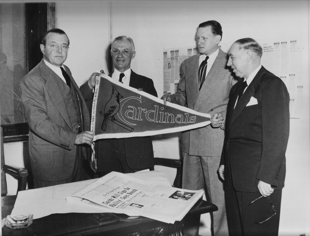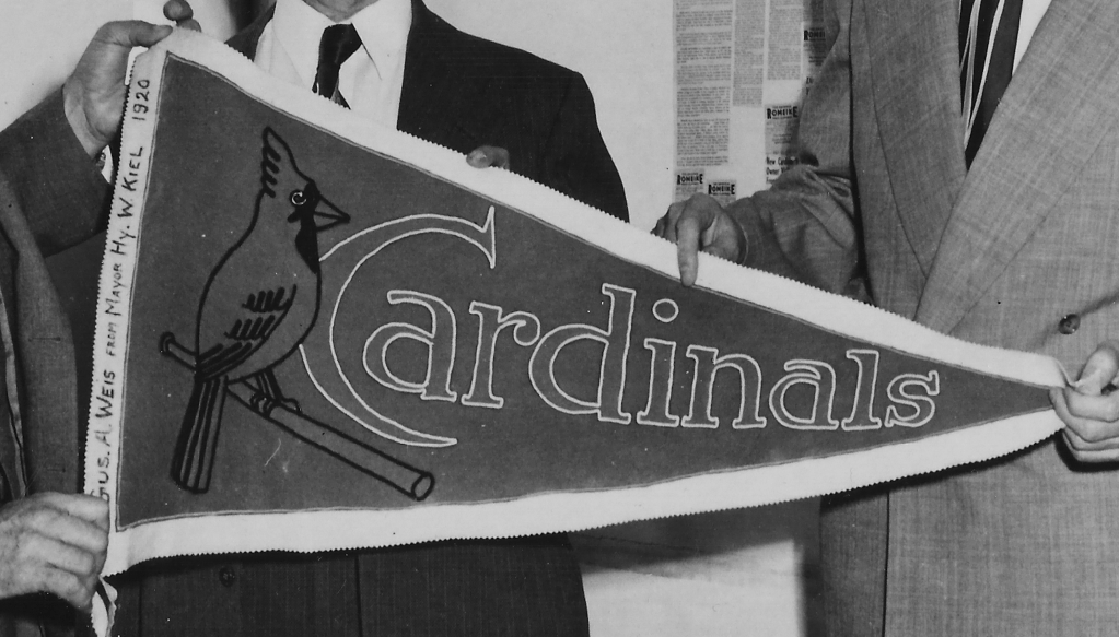 We have a photograph, likely from February of 1953, of August Busch. We are fairly certain this shortly after Busch bought the Cardinals based on the newspapers seen on the table and the wall. Gussie is holding a pennant with a single Bird on Bat and the word Cardinals. Curiously, the border of the pennant has a hand written label that says “GUS. A. WEIS FROM MAYOR HY. W. KIEL 1920”