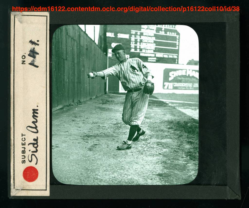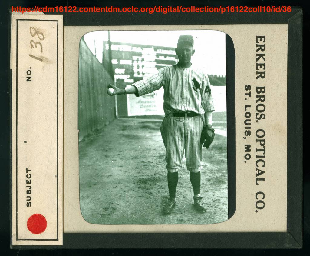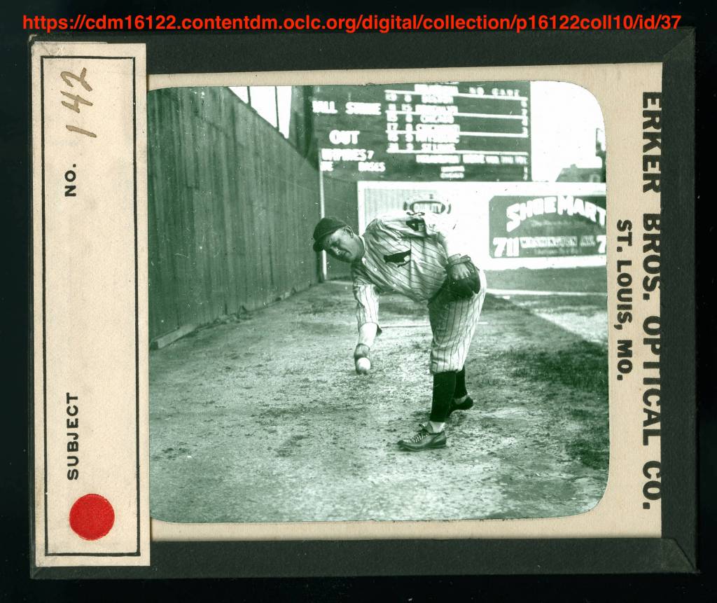 After eluding us for a long time, we found a collection of photographs and a newspaper corroboration that revealed the Cardinals “weekday” uniform was a pinstriped jersey that featured a single bird on branch. However, new research from Jeff Scott at birdbats.com has revealed the newspaper was incorrect. The Cardinals wore this single bird jersey as their weekend/sunday uniform.