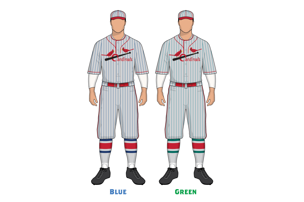 We have two physical samples to go on. The first is the regular season road jersey, which is a pinstriped Birds on the Bat jersey, and we would consider the pinstripes as blue on that uniform. The second sample is from Robert Edward Auctions, which we believe could be Jim Bottomley’s 1926 World Series road jersey. Careful analysis of the photos shows stripes that might be green, might be blue, and could fall into a turquoise or teal category. The precedent we have from 1918/1919, the 1926 road uniform, and presumably 1922, 1924, and 1925, all have blue pin striping. However we do have photographic and newspaper account proof the Cardinals wore green sock stripes and green pinstripes in 1927.