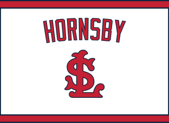 Rogers Hornsby was a player and then player-manager from 1915 through 1926, and in 1933. Hornsby is represented by an SL emblem because he didn’t have a true number in his time with the Cardinals. In 1923 when the Cardinals first experimented with sleeve numbers, Hornsby wore number 4 on one uniform and number 6…