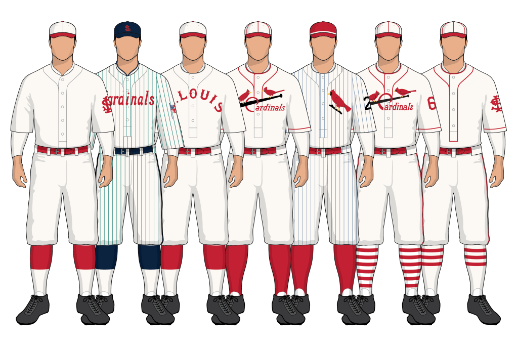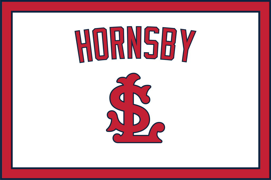 Rogers Hornsby was a player and then player-manager from 1915 through 1926, and in 1933. Hornsby is represented by an SL emblem because he didn’t have a true number in his time with the Cardinals. In 1923 when the Cardinals first experimented with sleeve numbers, Hornsby wore number 4 on one uniform and number 6 on another uniform, and in 1924 he wore number 6. When he returned in 1933, he wore number 4. Hornsby wore many different uniforms and logos in his time with the Cardinals.