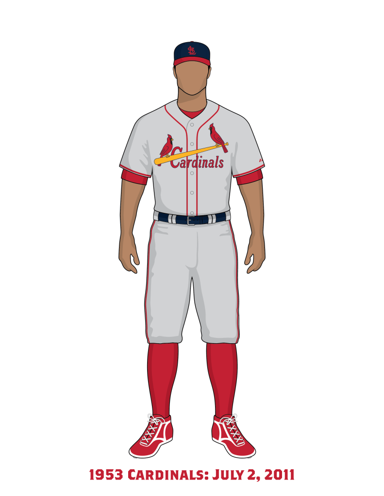 July 2, 2011 the Cardinals wore 1953 throwbacks. It is important to note that the STL emblem worn on the cap for these throwbacks is not accurate and does not represent the STL emblem worn by the Cardinals in 1953. This particular STL logo was used by MLB for many years to represent 1940s and 1950s Cardinals, but it is not an authentic recreation.