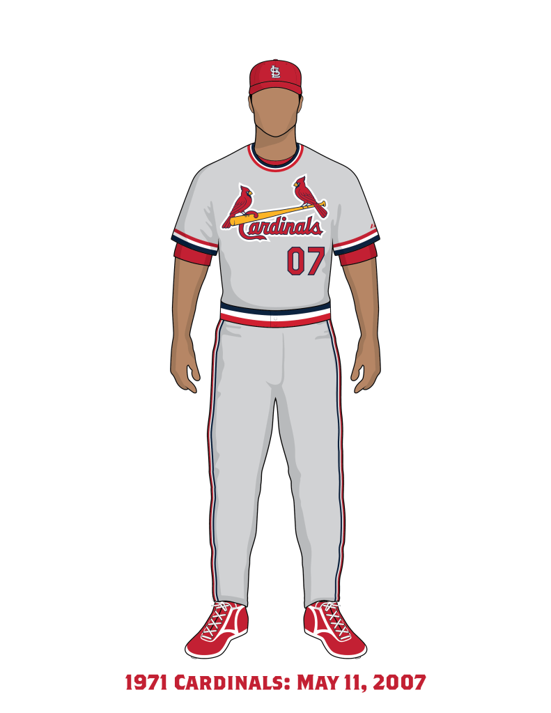 May 11, 2007 the Cardinals wore 1971 throwbacks. It is important to note that in no way does the Birds on the Bat worn on these throwbacks represent the 1971 Birds on the Bat, nor do they officially represent any current Birds on the Bat. The logo used was a poorly stitched patch applied on white felt and then applied on the jersey as a patch. It is not an authentic recreation of 1971 nor 2007.